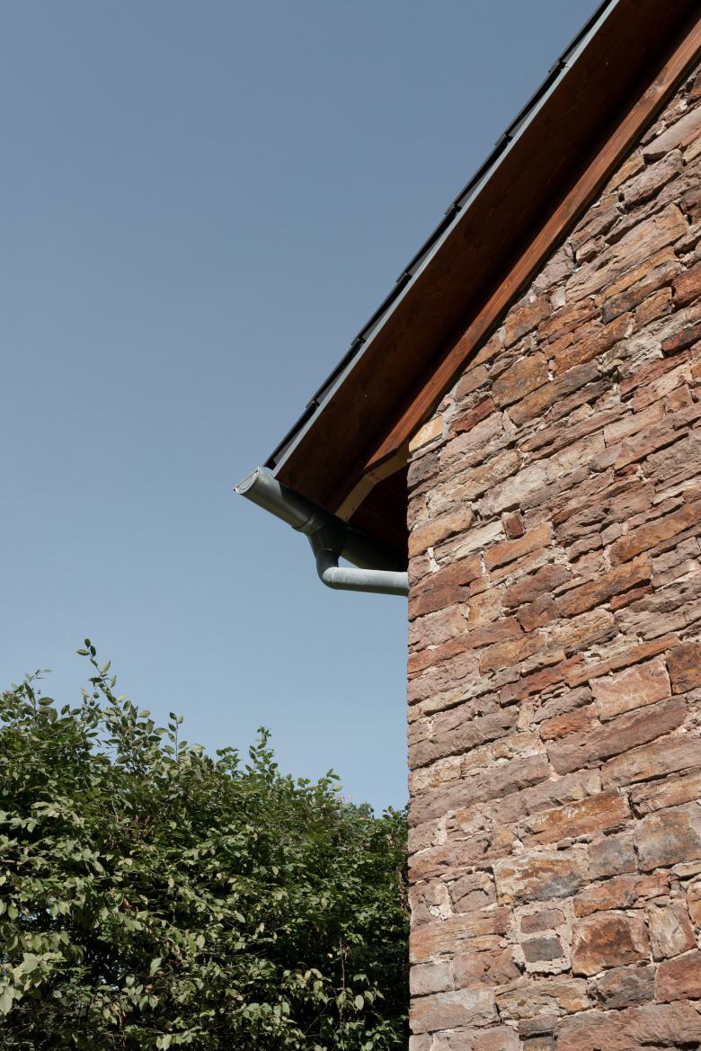 Die Gebäudehülle blieb unverändert, Schäden am Mauerwerk wurden fachgerecht repariert, das neue Dach durch sorgfältige Detailausbildung der Dachränder maßstabsgerecht auf den Mauerwerkskubus abgestimmt, die Fenster blieben erhalten.