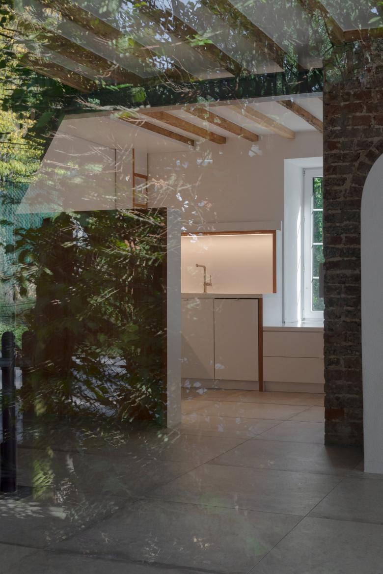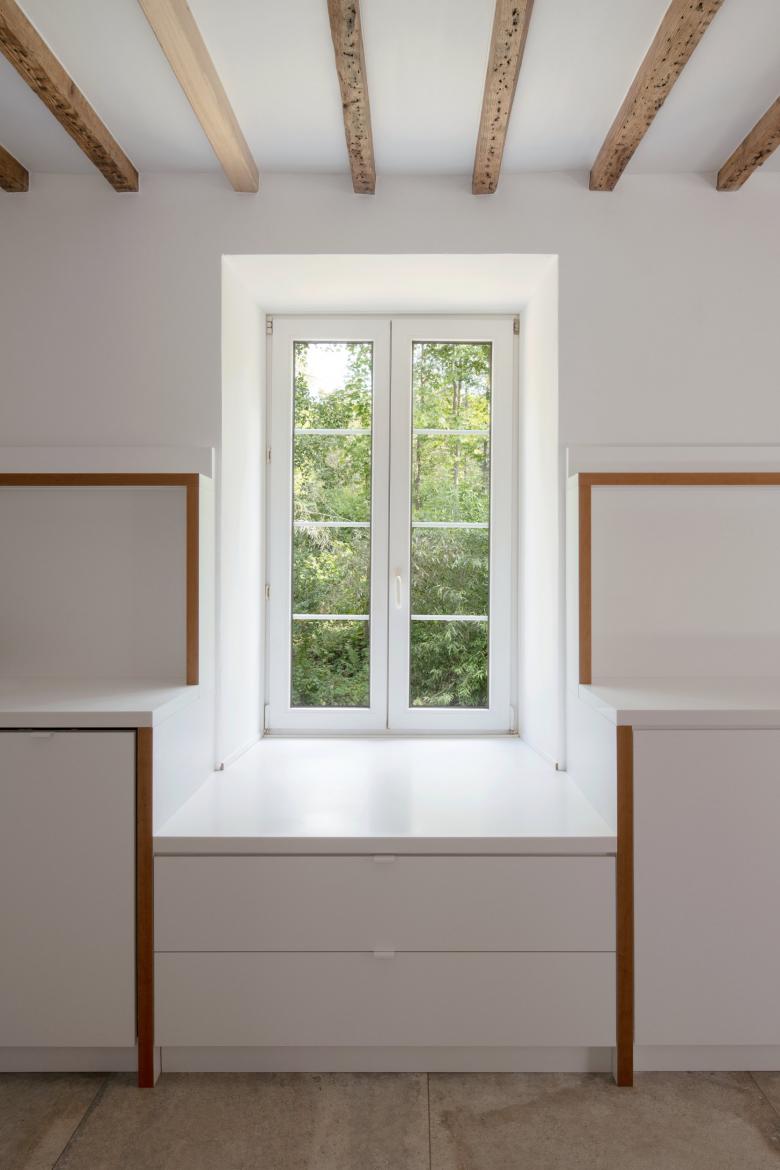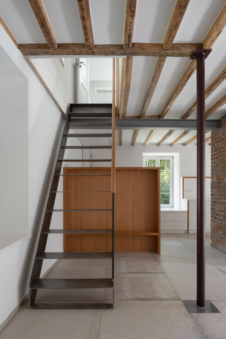 Eine neue Bodenplatte hob das Erdgeschossniveau an, trennte den Keller vom Erdgeschoss und schuf die Grundlage für eine fachgerechte Abdichtung. Man eliminierte die Holzkonstruktionen im Erdgeschoss, leitete Lasten aus Decke und Obergeschoss auf die massiven Außenwände und neue sichtbare Stahlelemente ab und ersetzte die zerstörte Holztreppe durch eine Stahlstiege. Mineralische Materialien an Wänden und Böden ermöglichen einen Mindestwärmeschutz aber auch eine verläßliche Austrocknung bei künftigen Überflutungen. Technische Einrichtungen wurden ins Obergeschoss verlagert, notwendige Leitungen im Erdgeschoss „auf Putz“ verlegt.