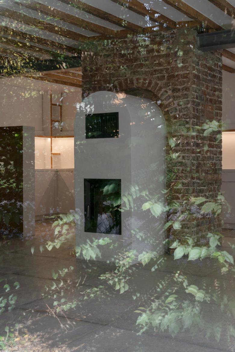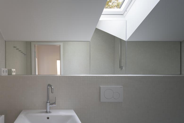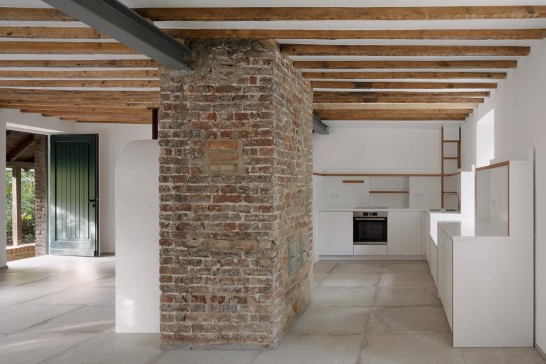 Im Erdgeschoss entstand ein Einraum, der durch den mittig gesetzten Kamin in verschiedene Zonen unterteilt wird. Die Küche befindet sich in einer dieser Zonen und lässt den restlichen Raum offen für flexible und im Flutfall schnell demontierbare Möblierung. Im Obergeschoss entfernte man die Zwischendecke zum Speicher, wodurch die Dachkonstruktion freigelegt und die Räume höher und großzügiger wurden.
