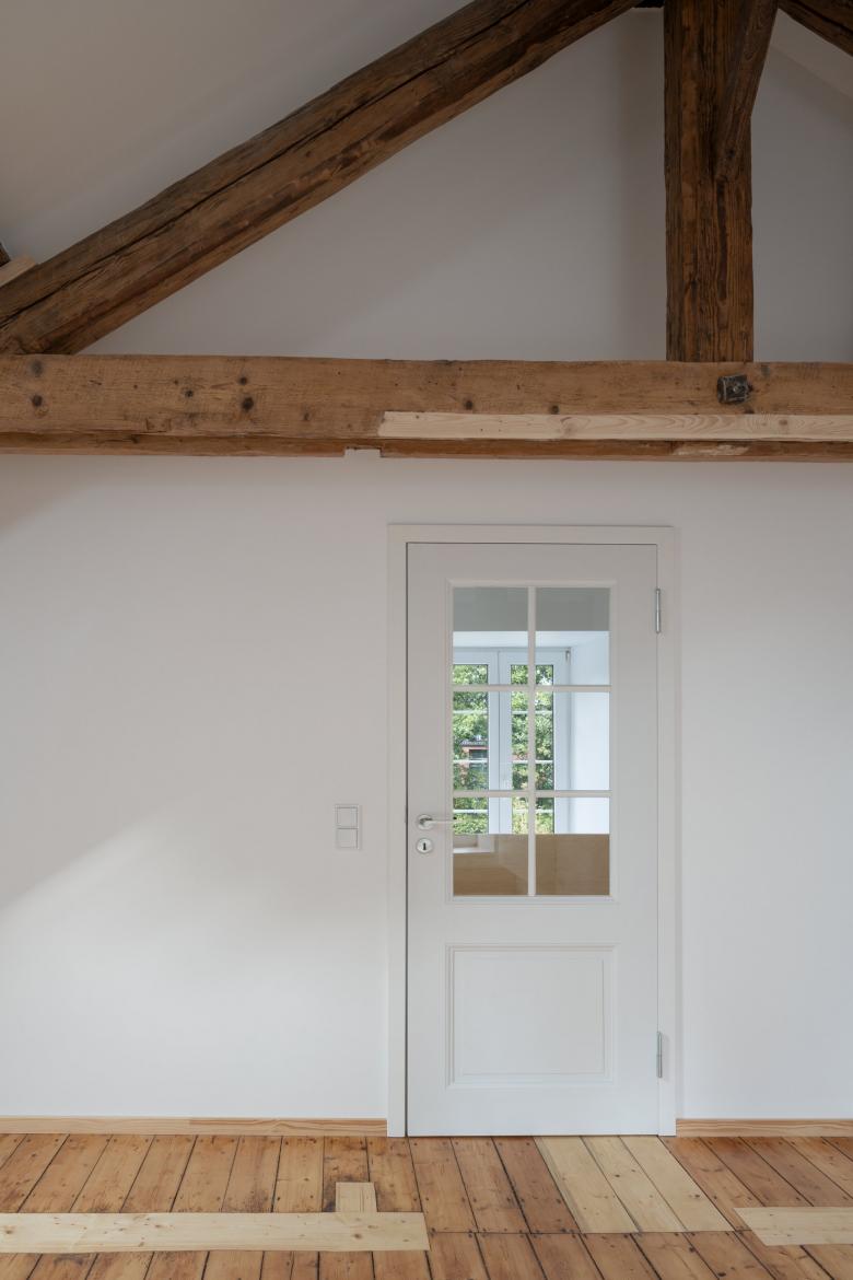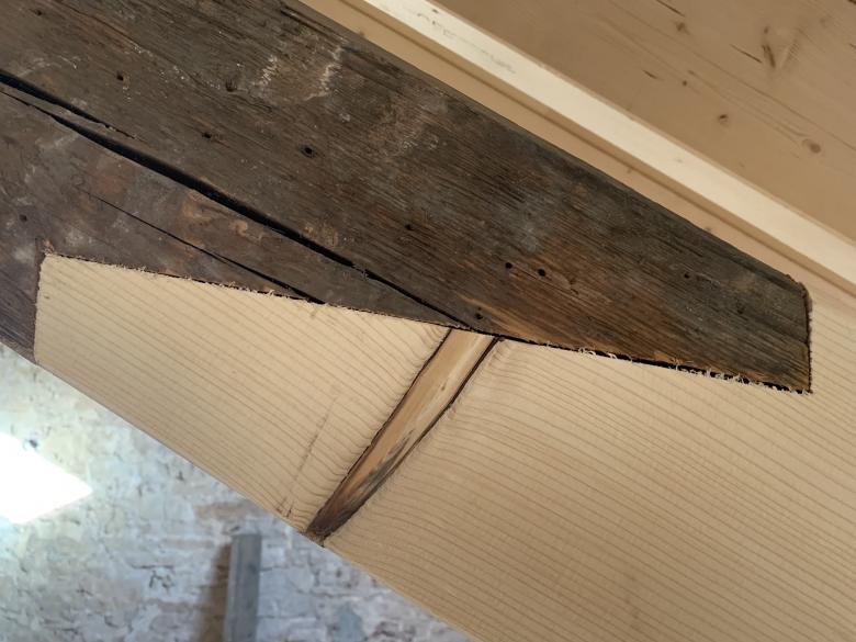 Schäden in den bestehenden Holzkonstruktionen wurden durch Holzprothesen behoben, der Dielenboden durch passgenaue Einfügung neuer Hölzer ergänzt. Spuren der Reparaturen bleiben im gesamten Gebäude sichtbar.