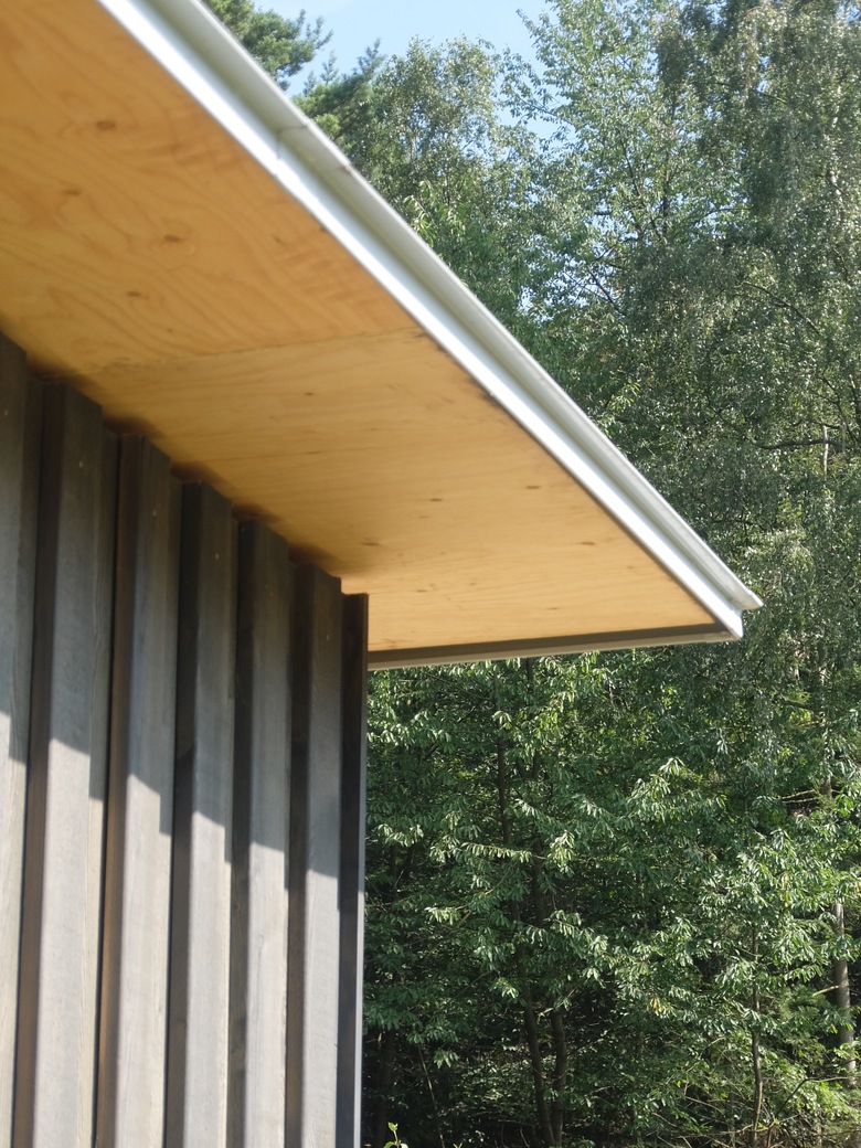 Das neue Garagengebäude ist als einfacher, flacher, und scharf konturierter Holzkubus ausgeführt und so positioniert, dass die Zufahrt räumlich gefasst wird, das Bestandsgebäude jeodch nach wie vor frei in der Wiesenlandschaft stehend zur Geltung kommt.