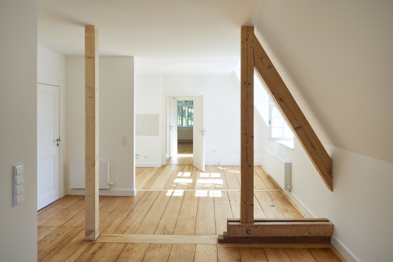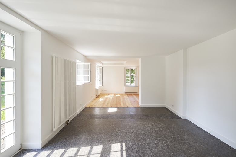 Im Zuge der Abbrucharbeiten kam im Erdgeschoss ein zwar stark zerstörter, aber reparabler Terrazzoboden zum Vorschein, dessen Fehlstellen ergänzt werden konnten. Die durchfeuchteten Fußbodendielen im Erdgeschoss wurden ersetzt durch Dielen aus vom Bauherrn selbst geschlagenen und gesägten Douglasienholz.