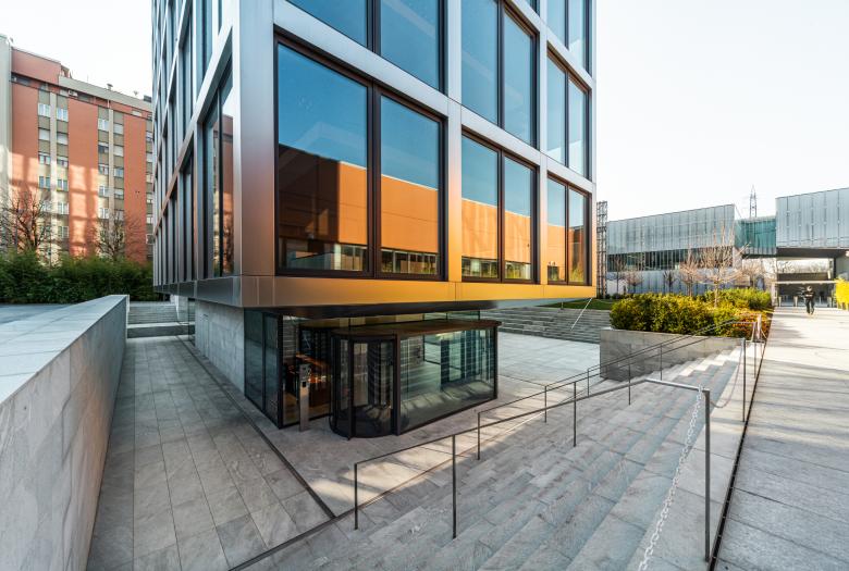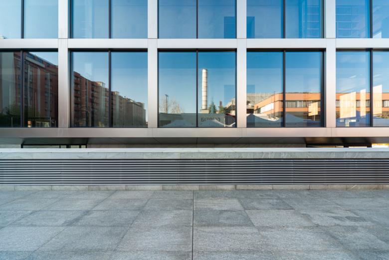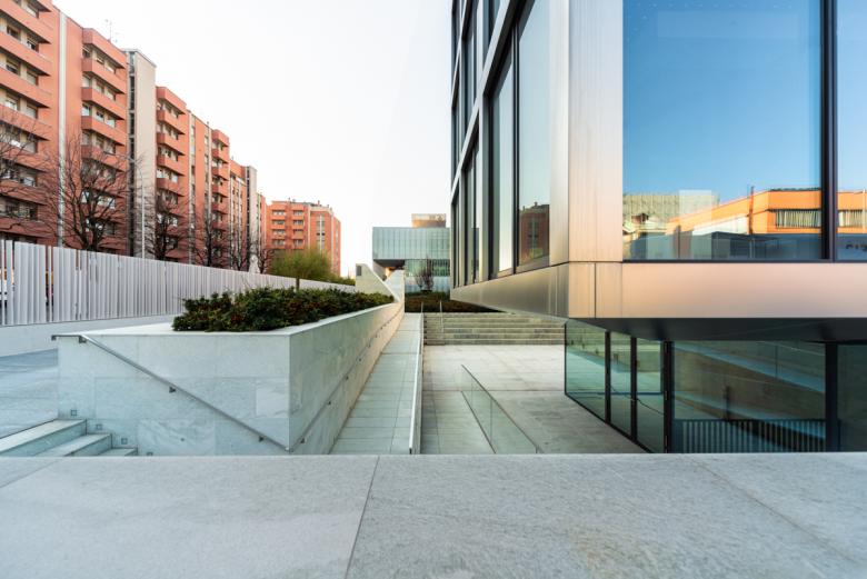 The new building is configured as a simple volume suspended in the new landscape, whose facades - defined by a regular grid - give a high degree of abstraction with respect to the dissonances of the surrounding buildings and allude, through the rigor and transparency of the materials, to the precision of industrial production that takes place within the sector.