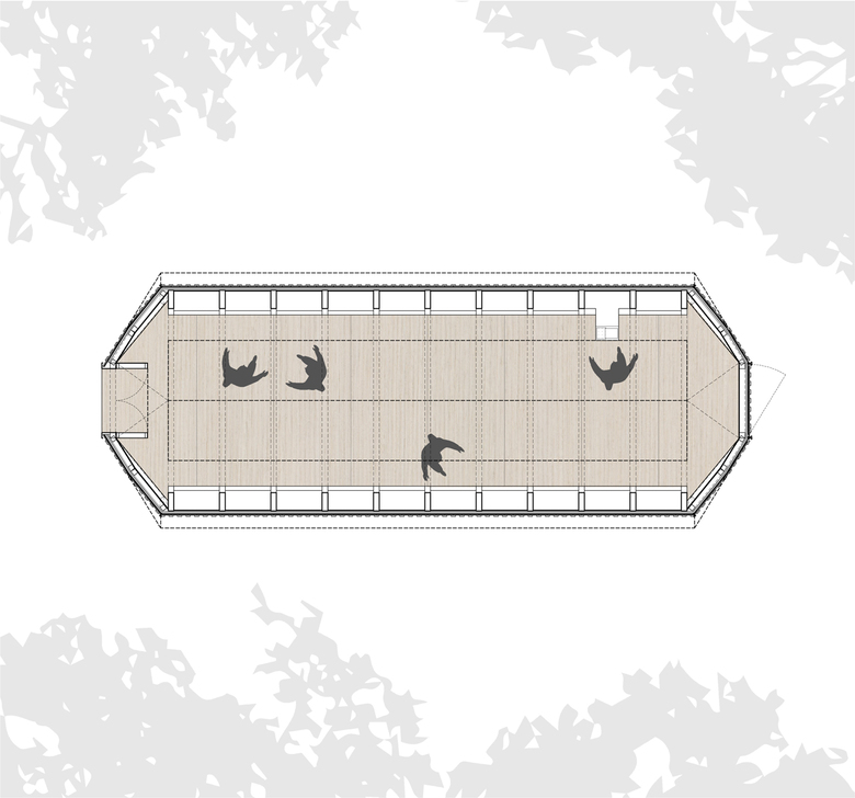 Il manufatto – lungo circa 11,00 m, alto 8,00 m, sorretto da undici portali in legno lamellare che definiscono dieci campate - si configura sostanzialmente come una copertura a falde dalla proporzione verticale enfatizzata, caratterizzata da un rivestimento continuo in scandole lignee interrotto solo dalla presenza di una serie di lucernari triangolari filofalda posti su entrambi i lati.