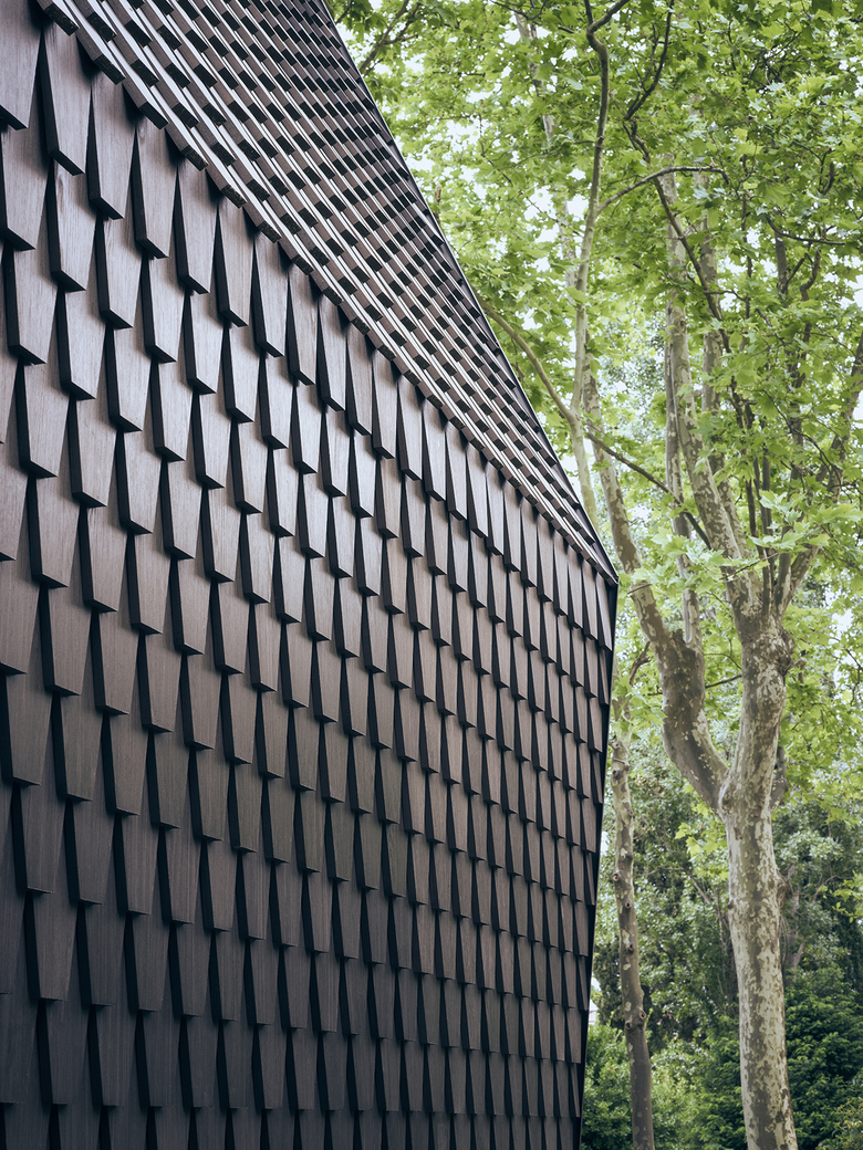 Si immagina che lo spazio espositivo sia definito da un forte contrasto cromatico tra il materiale ligneo scuro delle scandole esterne e il legno chiaro del rivestimento interno, opportunamente illuminato da luce zenitale resa più morbida attraverso una schermatura a controguscio.