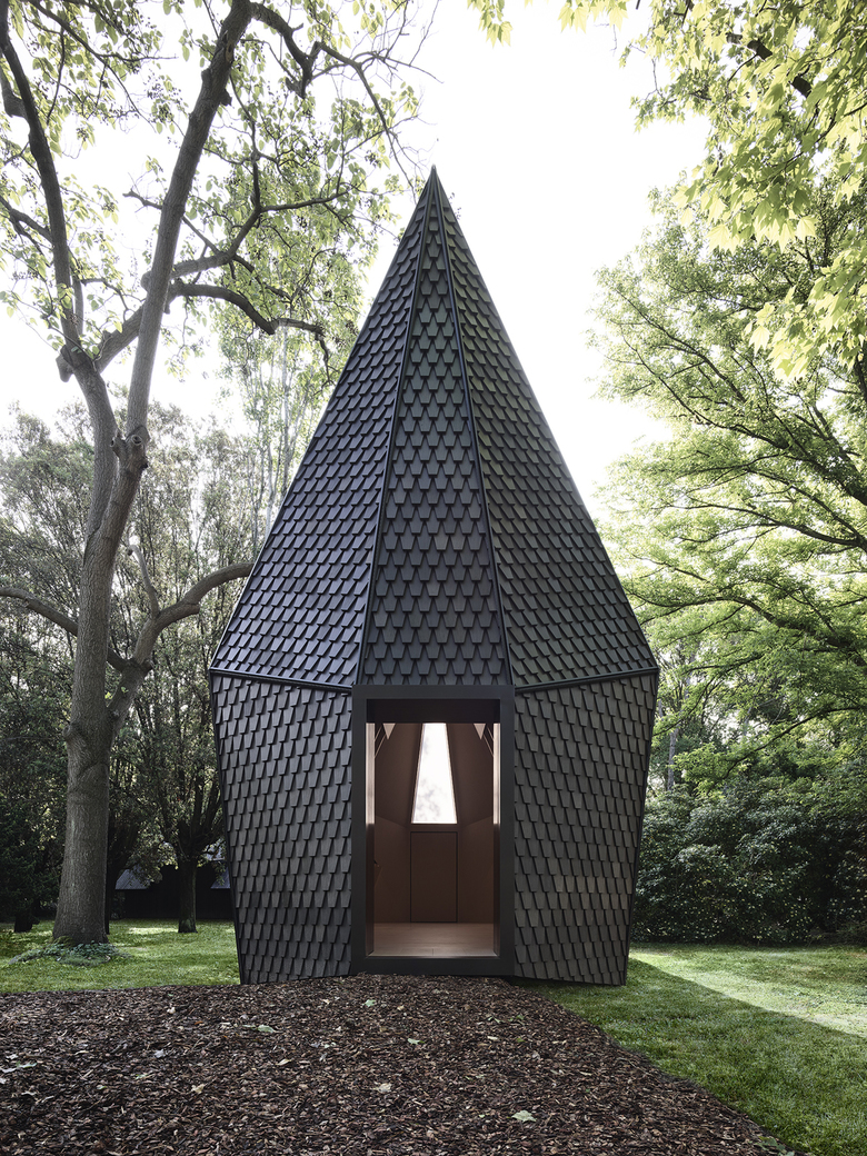 L’elemento nella sua assolutezza intende alludere sia alla stereometria degli edifici d’appoggio (EKONOMIBYGGNAD) disegnati da Asplund e Lewerentz per il cimitero di Skogskyrkogården, sia al tema e alla spazialità della capanna-rifugio nella natura.