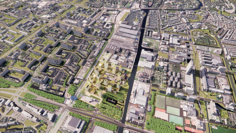 The Delft Kabeldistrict (cable district) is a distinctive contemporary urban expansion in which a business park is being transformed on a large scale into a vibrant living and working environment. The Kabeldistrict builds on existing qualities, activity and the industrial past of the existing large Cable Factory. The visible fusion of old and new creates its own identity that contributes to a strong cohesion and connection between future entrepreneurs and residents. With a high degree of circularity and a layered integration of greenery and water, Delft is at the forefront of productive and sustainable area development.