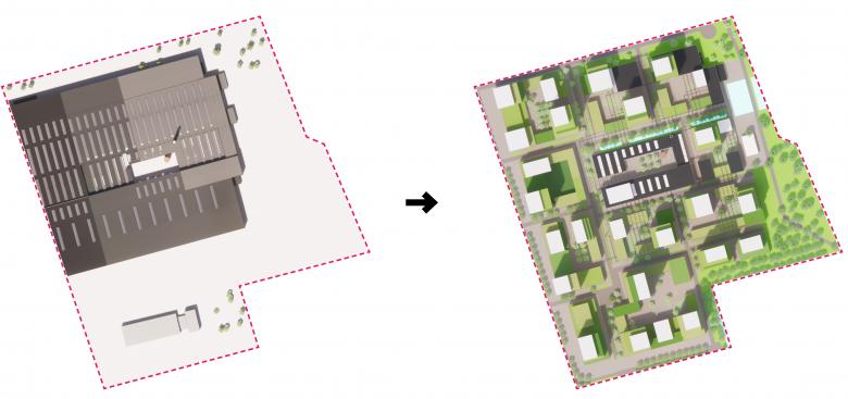 This typological mix of small-scale residential-to-work homes and above-ground / high-rise buildings is used as a template for the new construction in the area around the existing factory. This creates a new unique city district with great cohesion.
