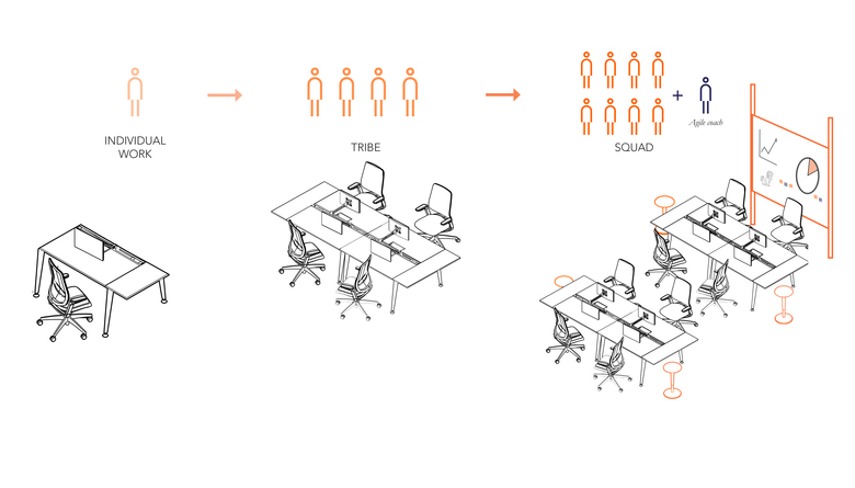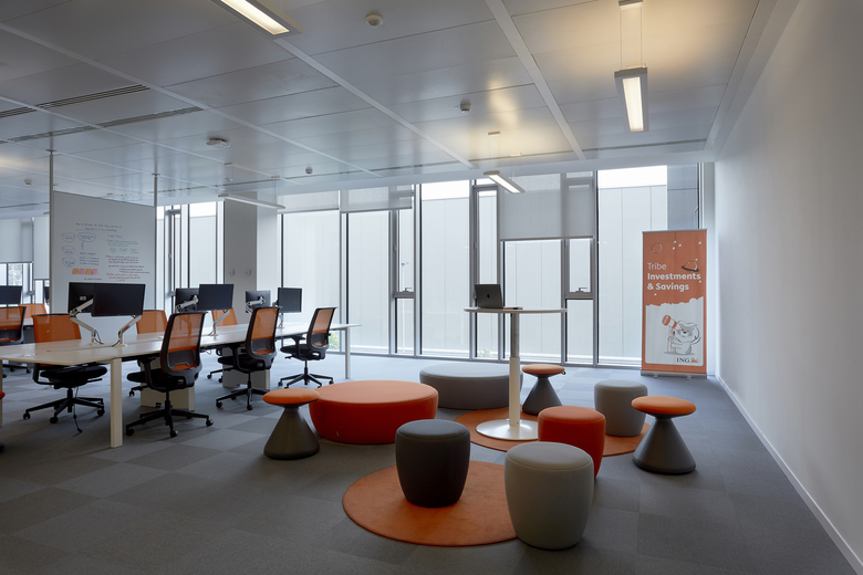 Progetto di workplace design. One Agile Way of Working in ING si caratterizza da 4 unità lavorative (consegna, vendite, assistenza e supporto). Differiscono nel livello di interazione. Queste differenze vengono prese in considerazione nell'Orange Workplace: i 'team agili' lavorano in una base domestica collaborando con più dinamiche con l'ufficio organizzato in spazi fluidi ed il lavoro più elaborato (meno o non agile) si svolge in una sede domestica più tranquilla per le singole commissioni di lavoro.