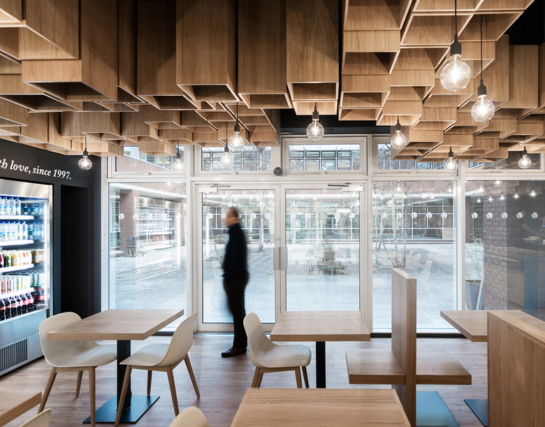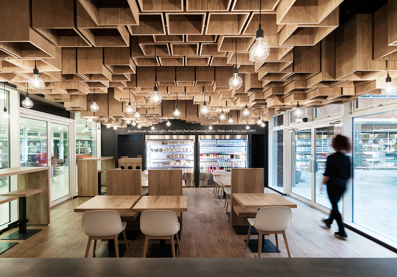 Il concept di Atkinson nasce dall'idea di creare uno spazio avvolgente e caldo per il cliente di Peabodys. Il legno è utilizzato su tutte le superfici; dal pavimento agli elementi di arredo come tavoli e bancone. Situato a Londra, nell'ala Atkinson Morley dell'ospedale St. George, il progetto pilota del franchising del gruppo Peabodys sviluppa con un approccio innovativo l'idea di caffee shop. Il legno è il protagonista del progetto; una serie di box dalla geometria naturale e sinuosa, distribuiti parametricamente, scende dal soffitto nascondendo al suo interno gli elementi tecnici del condizionamento e delle luci, garantendo inoltre un comfort acustico superiore. Il cliente si ritrova avvolto dal calore del legno, un feeling moderno e minimale ma al tempo stesso domestico e familiare. I medesimi materiali trovano spazio anche sul balcone principale e sui complementi di arredo; panche e tavoli sono disegnati da Modourbano per Peabodys e configurano l'open space in piccoli cluster dalla pivacy controllata.