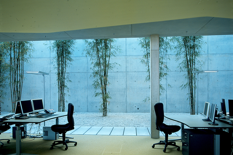 Vollverglaste, weit in die Landschaft ragende Arbeitsplätze und ein innenliegender Bambusgarten für Teambesprechungen betonen die nachhaltige Strategie des Unternehmens.