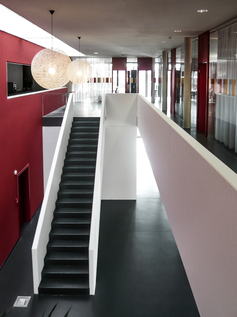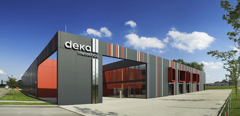Gewerbebauten wie Messestände bestehen gegenüber der heterogenen Unverbindlichkeit ihrer gebauten Umgebung durch einen leicht verständlichen gestalterischen Ausdruck. Maximale Präsenz und Signifikanz, bei gleichzeitigem Einsatz einfachster Mittel, ohne jedoch dabei laut oder gar beliebig zu werden.Ein Code aus farbigen Streifen verbindet unterschiedliche Nutzungsbereiche und Fassadenkonstruktionen zu einem homogenen Erscheinungsbild. Ein offenes Atrium vor dem Eingang schließt die Fluchten zum kompakten Baukörper.Im Zentrum der Verwaltung transparente Arbeitsbereiche und offene Kommunikationsflächen.
