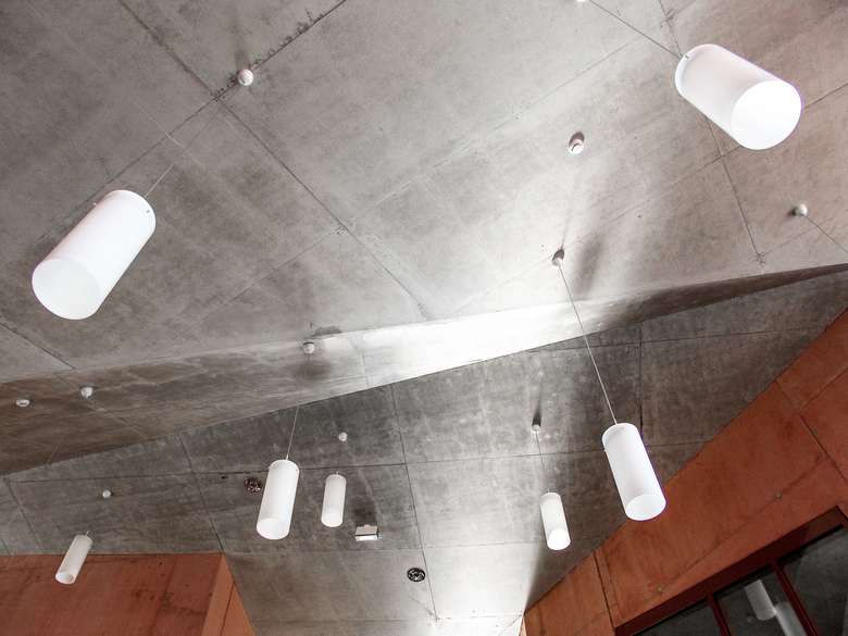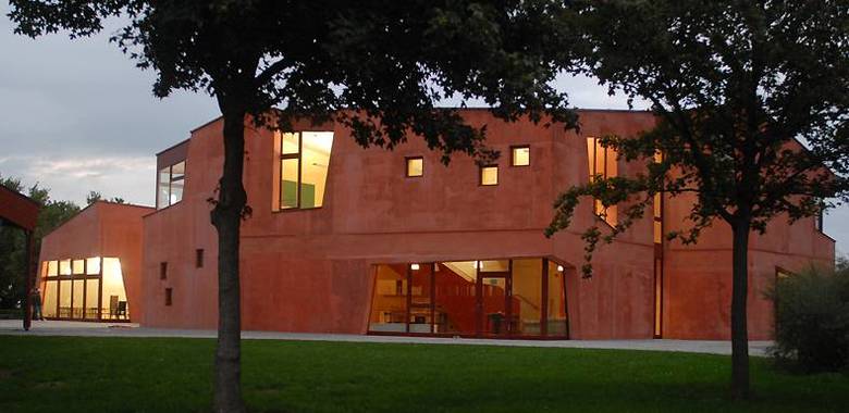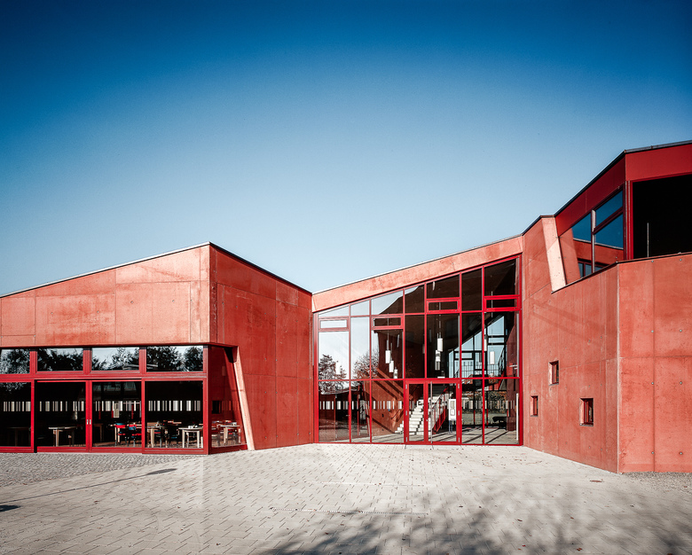 Ein Bauwerk wie eine begehbare Skulptur, gegossen aus rot pigmentiertem Beton. Räumliche Verbindung bestehender Schulgebäude und Reaktion auf die bewegte Geometrie der Umgebung. Städtebaulicher und inhaltlicher Mittelpunkt einer ideell motivierten Schulgemeinschaft. Raum zum Lesen, Lernen und Bewegen. Eine große Mensa ist Treffpunkt und Veranstaltungsort. Roher Beton an Wänden, Decken und Böden. Mal ruppig, mal glatt. Stets massiv und authentisch, mit zarten Abdrücken herbstlicher Ahornblätter.