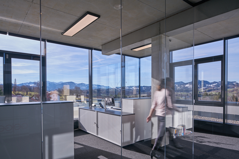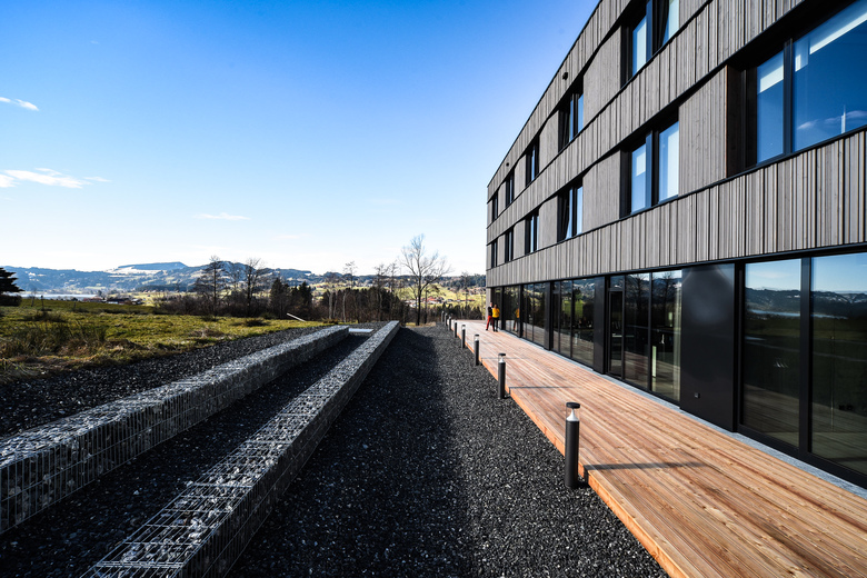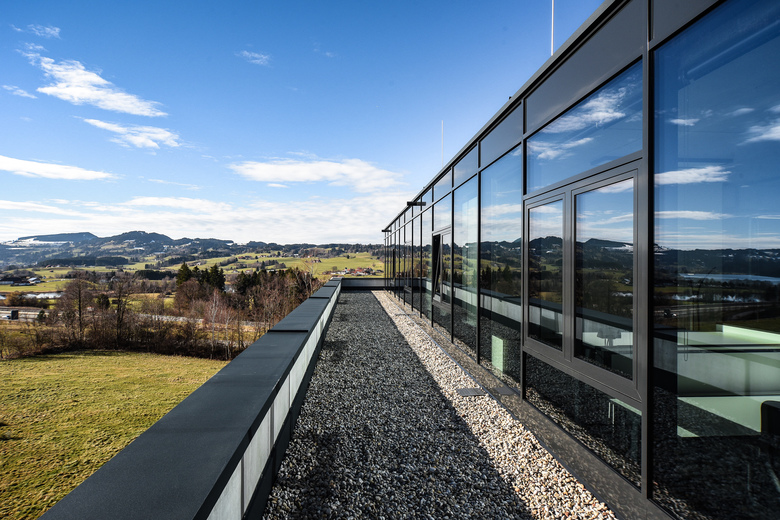 Gebäude für Verwaltung, Schulung und Konferenz für 150 Mitarbeiter des erfolgreichen Oberstdorfer Familienunternehmens. Landschaftsgerechte Fassade aus heimischen Bruchsteinen und naturbelassender Holzfassade, eingebettet in die malerische Topographie der Allgäuer Berglandschaft.