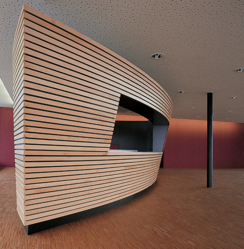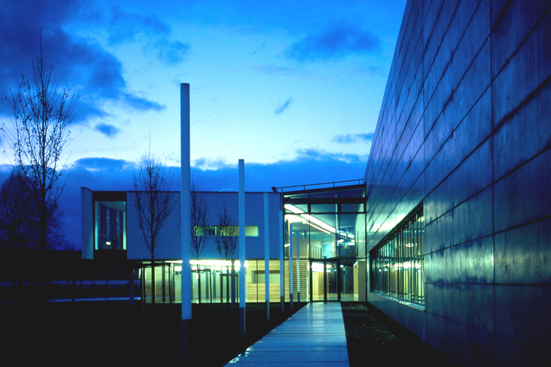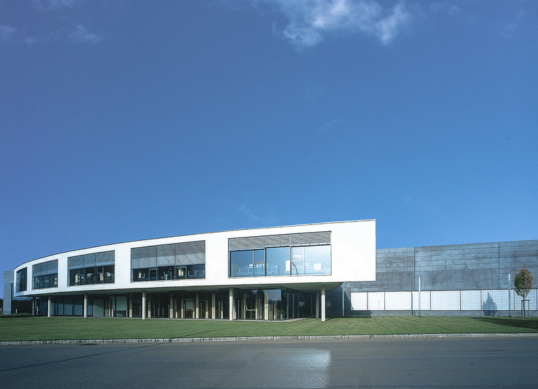 Wie ein anlegendes Schiff, über Gangways mit dem Werk verbunden, liegt leicht schräg davor der geschwungene Baukörper der Verwaltung. Entsprechend der enormen Dynamik des Unternehmens, ist das Werk einer permanenten Expansion und Umgestaltung unterworfen.
