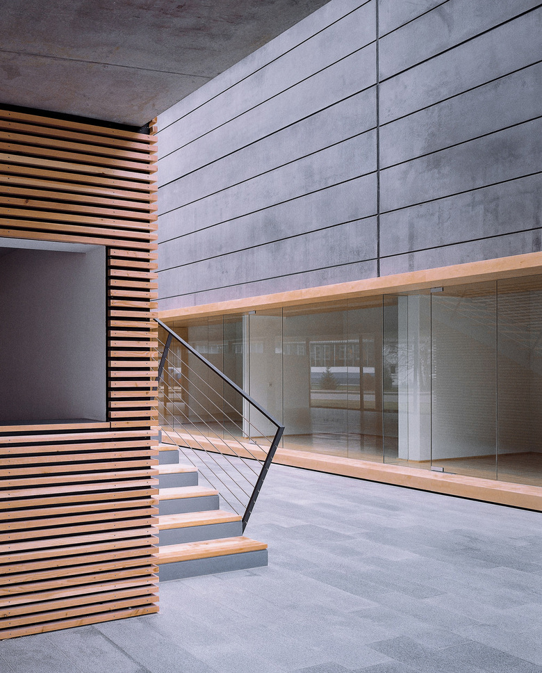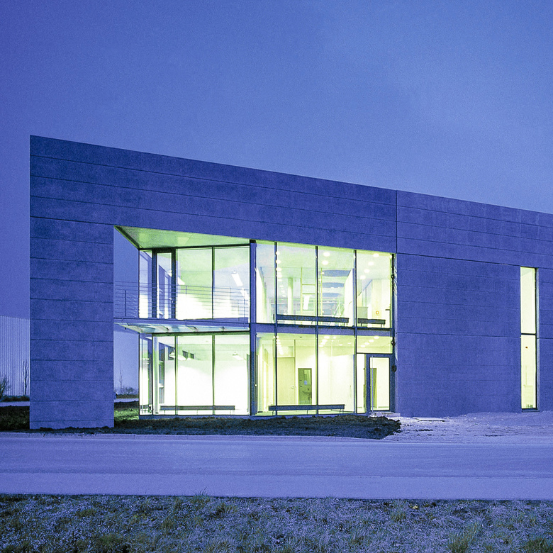 Eine 200 Meter lange Wand aus schwarz pigmentiertem Beton – zwischenzeitlich ins CI der Unternehmensarchitektur integriert – markiert die Eingangsfassade der 60.000 m2 großen Werksanlage. Dahinter liegen Produktion, Lager und Logistik.