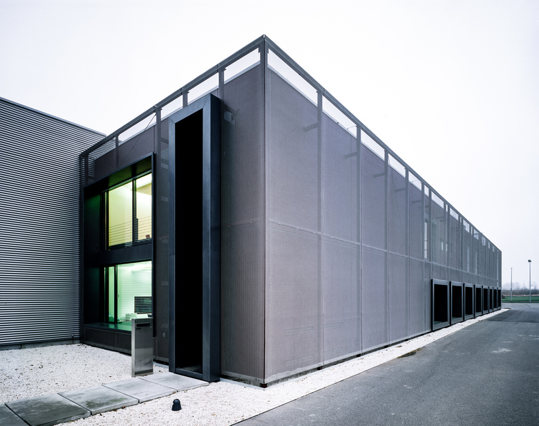 Erweiterung und Neugestaltung einer gesichtslosen Produktionshalle zu einer modernen Werksanlage mit Verwaltungsgebäude, SchulungsCenter und Logistik. Offene Raumabfolgen und transparente Übergänge zwischen Verwaltung und Produktion unterstützen die interne Kommunikation des erfolgreichen Unternehmens. Eine vorgehängte Netzfassade aus Edelstahl überspielt den Übergang zum Altbau und verleiht dem Gebäude ein technisch präzises Erscheinungsbild.