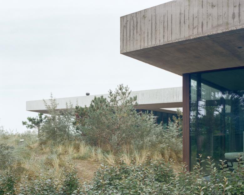 Private residence with views on the dunes. In order to embrace the naturally inconsistent relief, the different living areas have been implanted at different levels. Also the green roof adds to a complete integration in nature.