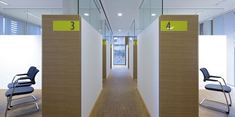 Zusammen mit dem bestehenden Forsthaus (nun Ordnungsamt) bildet der Neubau mit seinen Nutzungen Bürgerbüro, Zulassungsstelle, und Standesamt einen integralen Bestandteil des neuen Dienstleistungszentrums. Die Erschließung erfolgt über die breite Eingangstreppe sowie über eine an der Gebäudelängsseite angeordnete großzügige Rampenanlage, die in die Gebäudekubatur einbeschrieben wird. Den zentralen Ort innerhalb des Neubaus bildet eine die beide Gebäude verbindende Eingangshalle. Von hier aus können sowohl die Räumlichkeiten des Ordnungsamts als auch die von Bürgerbüro und Zulassungsstelle erreicht werden.
