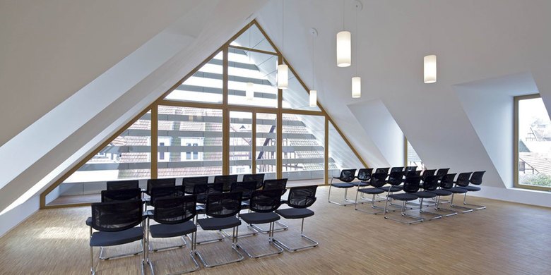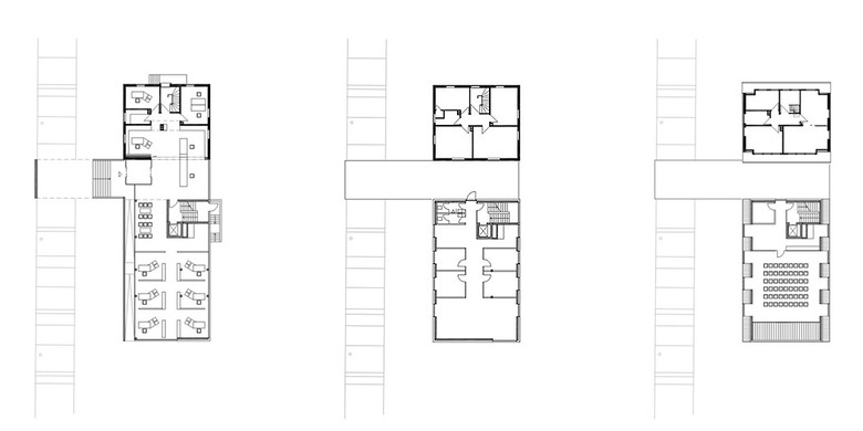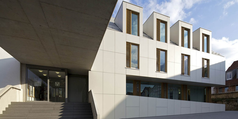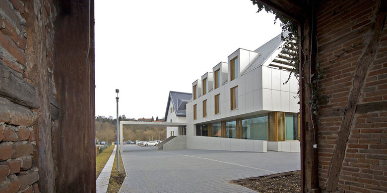 Das alte Forsthaus und der zweigeschossige Neubautrakt werden niveaugleich zu einem Gebäudeensemble zusammengefasst, das über einen gemeinsamen Eingang am zentralen Erschließungsweg erschlossen wird. In seiner formalen Ausbildung nimmt der zweigeschossige Neubaukörper Bezug auf die Gebäudetypologie des angrenzenden Forsthauses und setzt die Breite und Höhe des Bestandsgebäudes fort. In seiner Firstausrichtung orientiert sich der Neubau senkrecht zum alten Forsthaus und interpretiert so die wechselständige Dachlandschaft der angrenzenden Stadtkanten-Bebauung.
