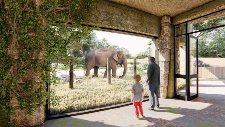 Das neue Konzept macht aus dem vorhandenen Grundstück einen unverwechselbaren Ort indischer Dschungel-Elefantenwelt und integriert gleichzeitig die Außenanlagen für die Roten Pandas und Wildrinder.