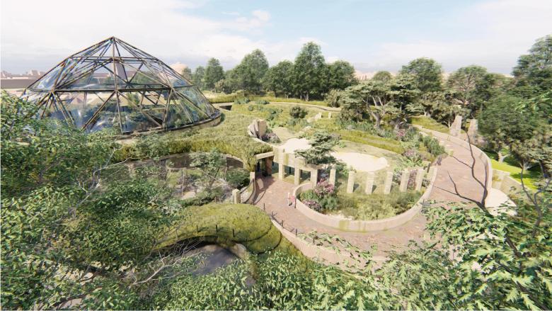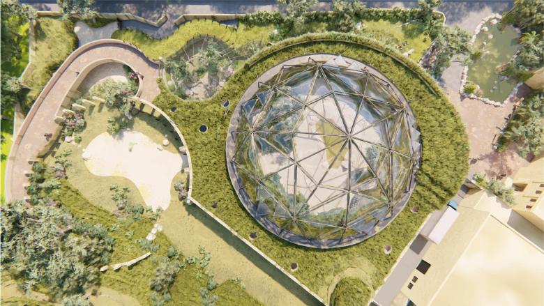 Die Entwurfsidee der neuen Elefanten-Laufhalle entwickelt sich aus dem Thema „Dschungel“ mit all seiner Mystik und Faszination. Im Zentrum des Entwurfs steht die Warmhalle der Elefanten mit ihrer Exoskelett-Kuppelkonstruktion und dem bambusblattbedruckten Luftkissendach, durch das Tageslicht in die Halle flutet. Gleichzeitig bietet es Sonnen- und Wärmeschutz. Die Kuppel auf einem Kreisgrundriss ist mit 31 Metern Durchmesser und 19 Metern Höhe weithin sichtbar.