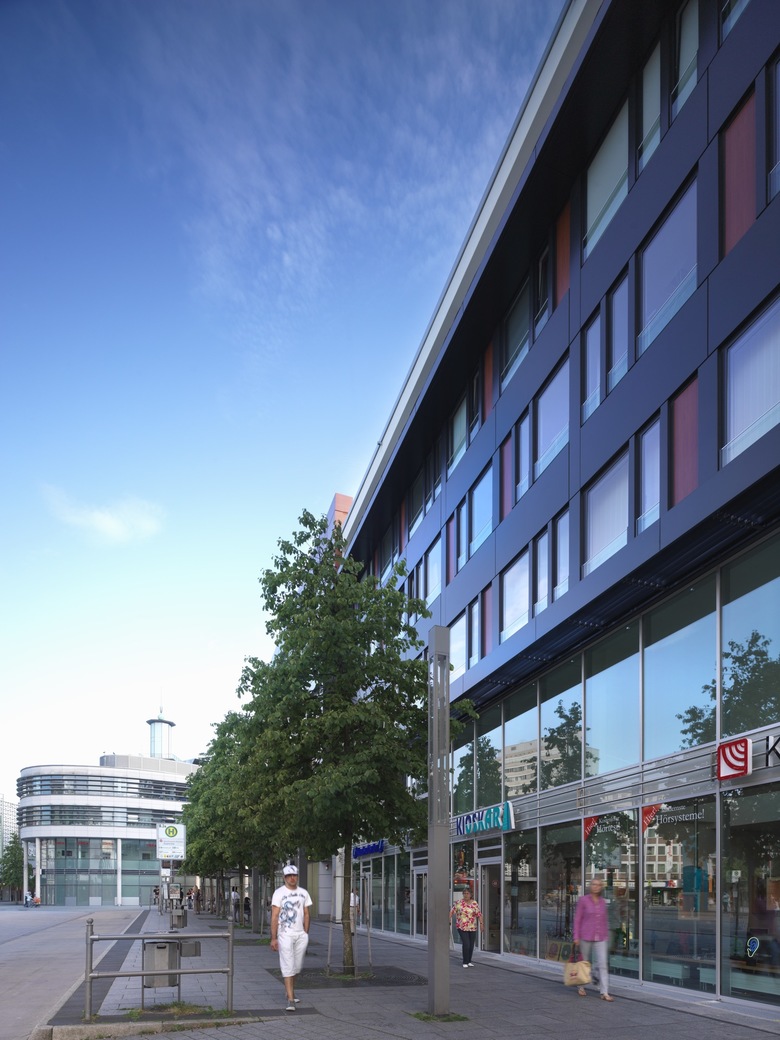 Die Ladenfassaden im Erdgeschoss öffnen sich mit großzügigen Glasflächen zum Außenraum. Die vorwiegend als Büros und Praxen genutzten Mieteinheiten in den Obergeschossen erhalten eine neue anthrazit-farbene Fassadenbekleidung.