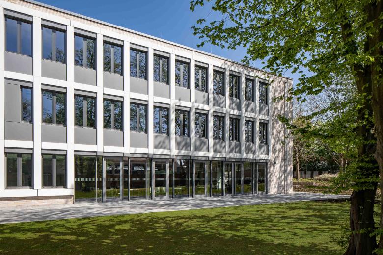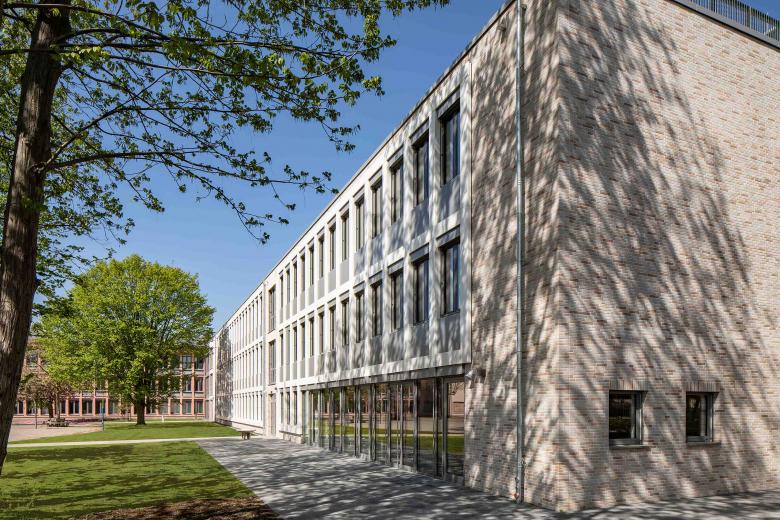 Das Bestandsgebäude des Cecilien-Gymnasiums in Düsseldorf stammt aus dem Jahr 1956 und erfuhr 2004 bis 2005 eine umfassende Sanierung. Nach Erhöhung von drei auf fünf Züge wurde eine Erweiterung notwendig, um allen Schülern ein zeitgemäßes Lernumfeld bieten zu können: Mit dem 2019 fertiggestellten Neubau konnten sich Lehrer und Schüler über zusätzliche 3.600 Quadratmeter Nutzfläche mit Klassenräumen für die Sekundarstufe l und ll sowie Fach- und Multifunktionsräumen freuen. In den Obergeschossen laden großzügige Aufenthaltsbereiche in den Fluren zum Verweilen ein. Zudem ist im Erdgeschoss eine Mensa untergebracht, die mit einer großen Fensterfläche hell und freundlich wirkt. Im Außenbereich direkt vor der Fensterfläche schließt sich eine 130 Quadratmeter große, weiträumige Terrasse an.