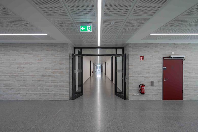 Das Gebäude in Massivbauweise aus Mauerwerk und Beton präsentiert sich von außen mit einer hellen Klinkerfassade und einem extensiv begrünten Flachdach. Einzelfenster in einem Rasterverband aus Aluminium sowie Pfostenriegelkonstruktionen schaffen eine klare Struktur und gleichzeitig eine Verbindung zum Bestandsgebäude. So entsteht ein harmonisches Gesamterscheinungsbild. Ein Glasgang verbindet den Neubau in allen drei Geschossen mit dem bestehenden Schulgebäude. Nach den Neu- und Umbaumaßnahmen ist das gesamte Schulgebäude barrierefrei. Es erfüllt die Leitlinien der Landeshauptstadt Düsseldorf für die Energieeffizienz bei Neubauten und unterschreitet die Vorgaben der Energieeinsparungs-Verordnung um 36,5 Prozent.