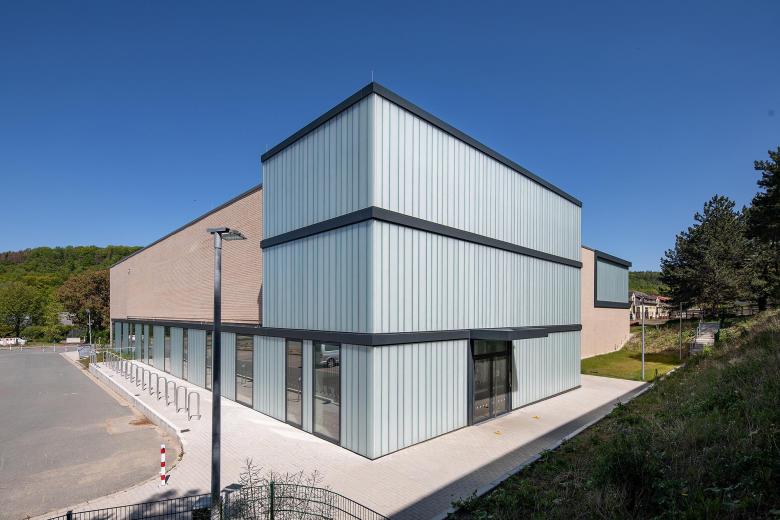 PASD plante den Verbindungstrakt mit großen Fenstern und einer Fassade aus sandfarbenem Klinker. Zusammen mit dem Foyer ist er das neue Herzstück der Schule. Er nimmt die städtebauliche Struktur der Bestandsgebäude von 1935 auf und fügt sich hervorragend in das Gesamtensemble ein. Mit seiner gradlinigen, modernen Architektur fällt der Verbindungsbau gleichzeitig auf. Kopfbauten ergänzen das Gesamtensemble städtebaulich und markieren wichtige Eckpunkte nach Norden und nach Süden. Dazu gehört am nordöstlichen Abschluss des Campus auch der Neubau der Turnhalle.