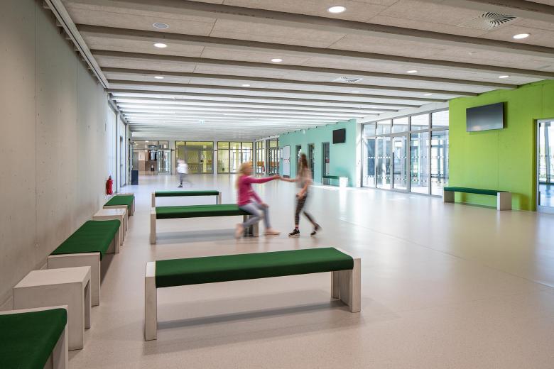 Das Foyer ist zusammen mit Pausenhalle und Aula in einem eingeschossigen Baukörper auf dem ehemaligen Vorplatz des Gebäudeensembles untergebracht, der außerdem zentraler Eingangsbereich ist. Der Baukörper bildet zusammen mit dem Verbindungstrakt das neue Gesicht der Schule. Auf dem Dach ist ein großzügiger, extensiv begrünter Aufenthaltsbereich konzipiert, den die Sekundarstufe ll als Schulhof nutzt. Zugunsten eines weiteren Schulhofs für die Sekundarstufe I wurde ein ehemaliger Parkplatz rückgebaut und über weite Teile mit Grünflächen versehen. Zahlreiche Spielmöglichkeiten dort sorgen für ausreichende Bewegungsfreiheit der Kinder.