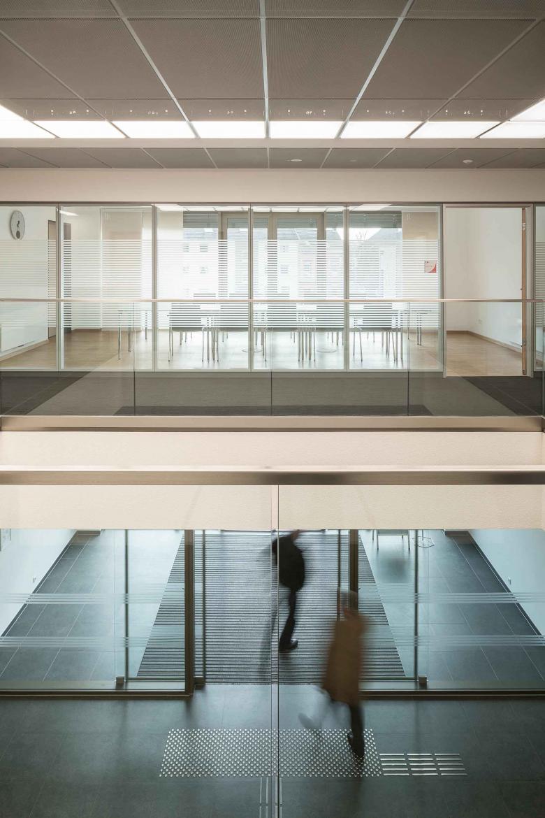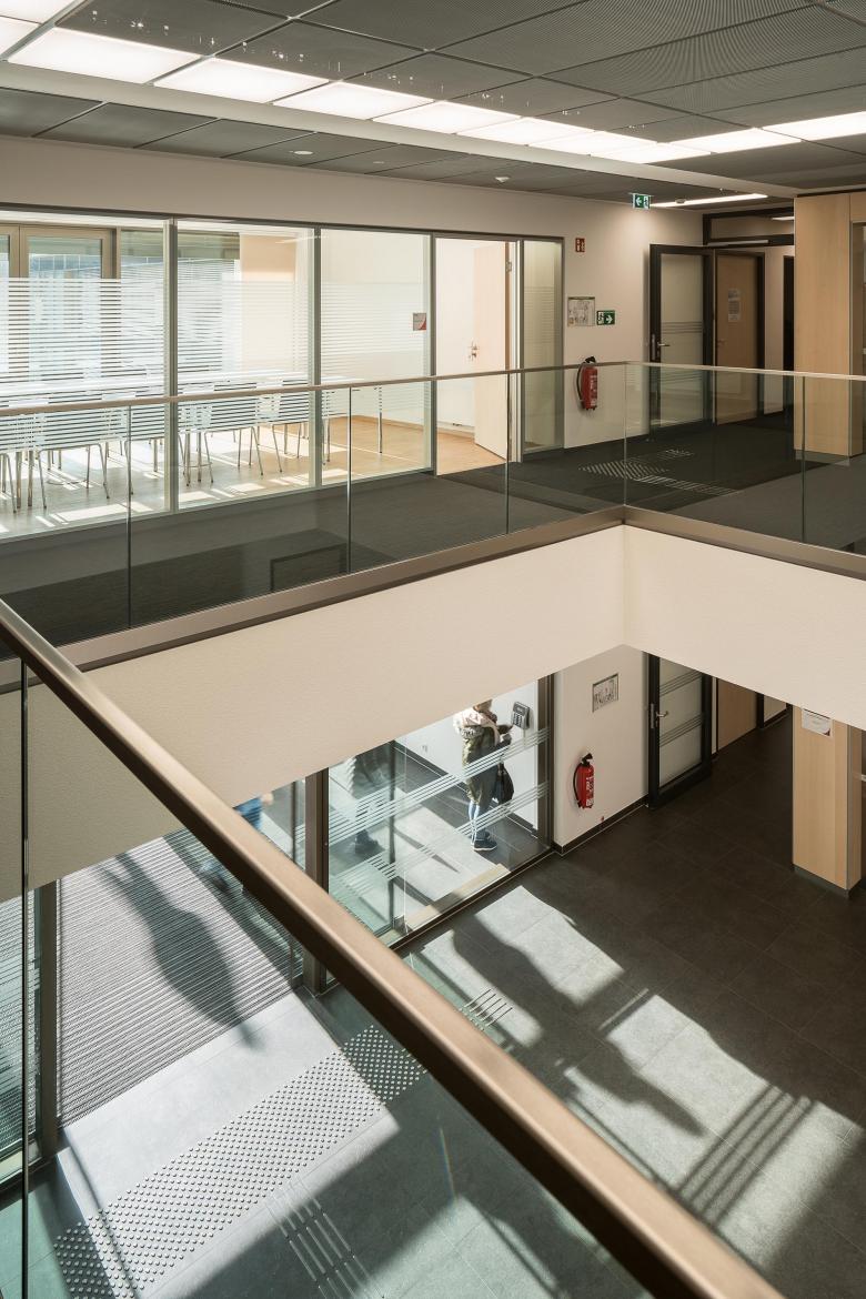 Die hell gestaltete, hinterlüftete Natursteinfassade des Neubaus sorgt dabei für einen freundlichen Empfang der Besucher. Der lichtdurchflutete, zweigeschossige Eingangsbereich erhält eine Kunst-Installation – ermittelt über einen Wettbewerb „Kunst am Bau“ – und soll die Identifikation der Bürger mit ihrem Rathaus zusätzlich stärken. Der bestehende Westflügel erfuhr eine umfängliche Sanierung sowohl der markanten Beton-Fassaden als auch des darin befindlichen Ratssaales und der Konferenzbereiche im 1. Obergeschoss. Der alte Ratstrakt erhielt zum Vorplatz eine zweigeschossige vorgelagerte Glashalle, die mit ihrer Transparenz und Leichtigkeit den Besucher in das neue Rathaus einlädt. Im Erdgeschoss ist hier die Bürgerberatung mit direkter Anbindung an das Foyer und die Kantine untergebracht. Unter dem Bestandsgebäude befindet sich eine teilsanierte Tiefgarage für 94 Stellplätze. Insgesamt zeichnet sich die Baumaßnahme durch hohe Barrierefreiheit aus. Eine Schadstoffsanierung (Asbest/PCB/KMF) erfolgte ebenfalls. An dem Gebäude wurde der PreCheck für die Zertifizierung DGNB in Silber durchgeführt. Alle dahingehenden Auflagen sind erfüllt und der Bauherr kann die Zertifizierung beantragen.