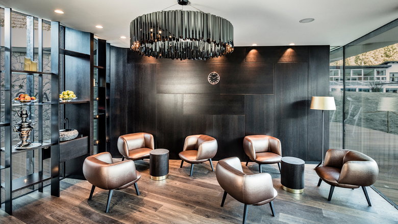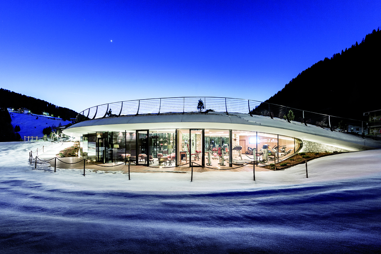 The new SPA, finished in December 2016, with a jubilant shot of dynamic contemporary architecture was designed by Perathoner Architects. As the spa is located in the garden area of the hotel, much consideration was given to how to minimize the visual impact of the new building on the site. The architects created grass-covered volumes that emerge partially from the garden and arranged the spa’s rooms around a naturally lit open patio. They employed dark and pale walls to create an intriguing interplay between darkness, shadow, and light. The floor-to-ceiling windows bring natural daylight deep into the building whilst the subterranean environment allows places for private relaxation. A glass passage connects the main part of the hotel with the spa facilities that include three saunas, two steam baths, a fitness room, an emotional Kneipp-Bath, a chill out area with fireplace and a vitamin bar.