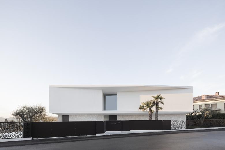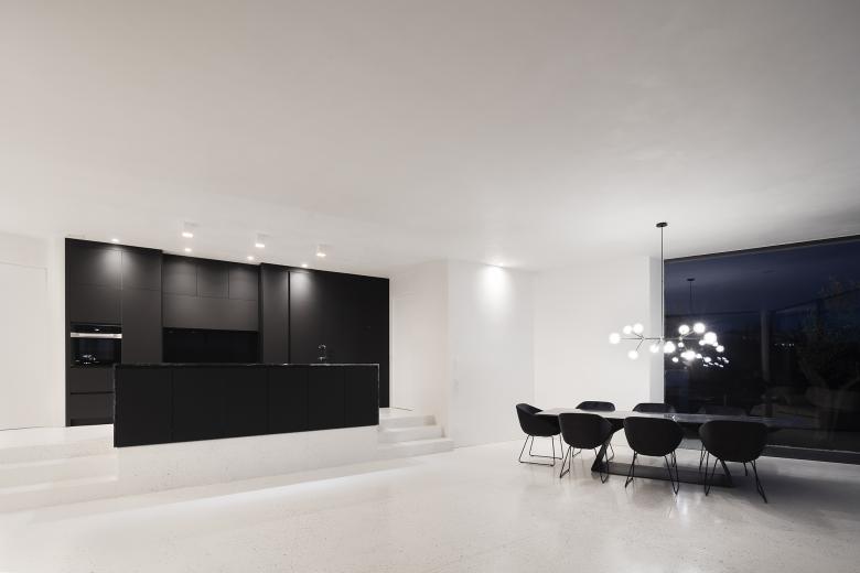 The combination of consequent reduction of the design language and the thoughtful use of the building materials utilized creates a contemporary, minimalist architecture that is strongly inspired by the rationalism of the early 20th century, without ignoring its structural context. The ground floor clad with local natural stone forms the base for the cantilevered upper floor, made of exposed concrete with white cement and aggregates made of Carrara marble and shuttered on site with millimetric precision.
