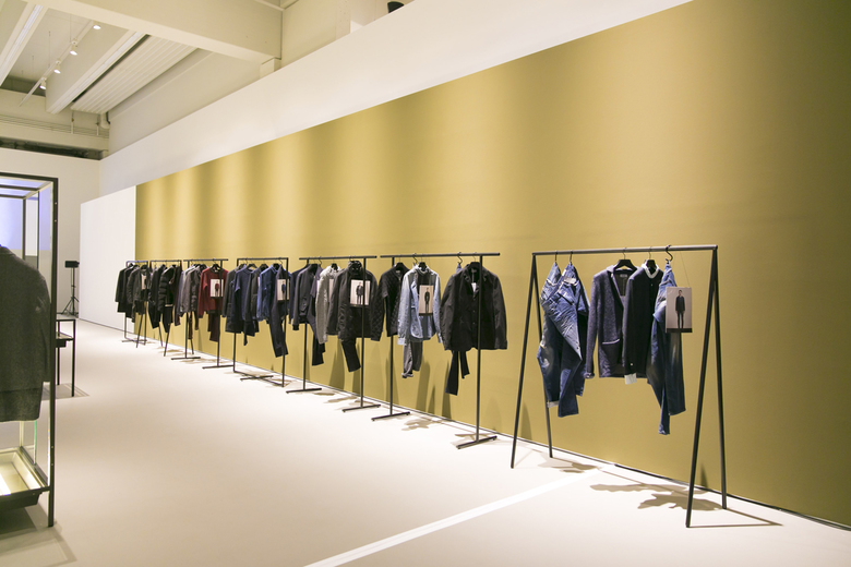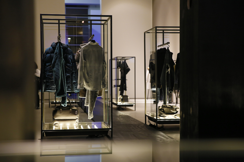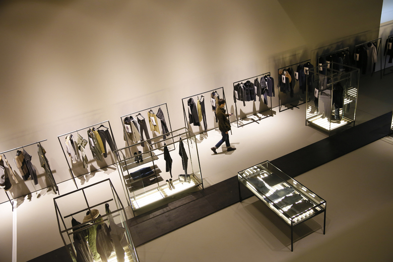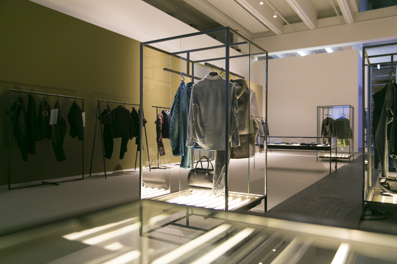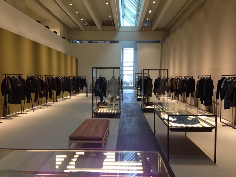 Ein schwarzer Holzsteg wurde entworfen, um sich durch den Raum zu schlängeln, der über dem hellen Boden zu schweben scheint und an beiden Seiten von Vitrinen flankiert wird. Die 2 m hohen maßgefertigten Schränke aus Glas in einem Gestell aus pulverbeschichtetem Stahl in Umbra-Grau hoben die Mode von Männern und Frauen auf unterschiedliche und progressive Weise hervor. Vom Boden der Vitrinen aus beleuchtet, erhielten die Kleidungsstücke einen schwerelosen Charakter, besonders wenn sie auf der Glasoberfläche der puren Vitrinentische lagen. Ergänzt durch drei verschiedene Formen von Kleiderstangen aus Stahl wurde die Präsentation der Kleidung durch gestrichene, curryfarbene Wände, eine einfühlsame Deckenbeleuchtung sowie Beamerprojektionen der Closed Laufstegsituationen unterstrichen.