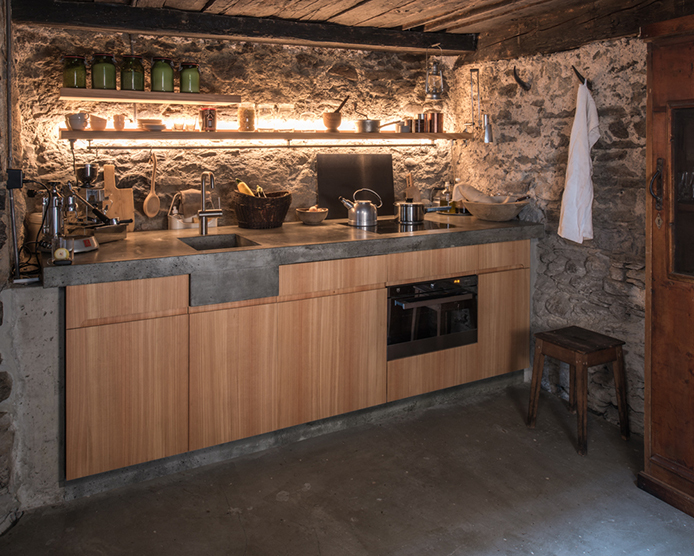 Behutsam wurden überflüssige Bauteile entfernt, um die ursprüngliche Struktur des Baus stärker hervorzuheben und gleichzeitig die Belichtung der Küche zu verbessern und den Zugang zum Obergeschoss zu ermöglichen.