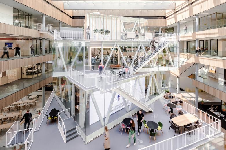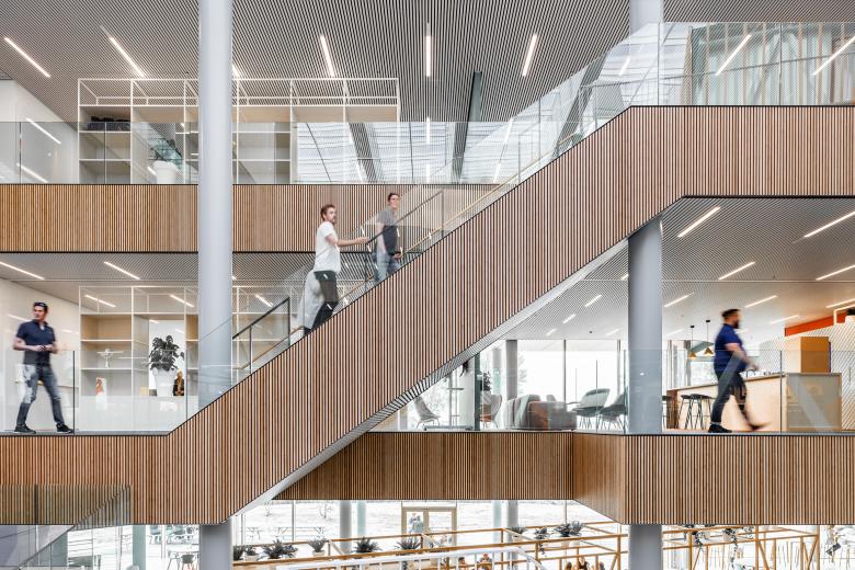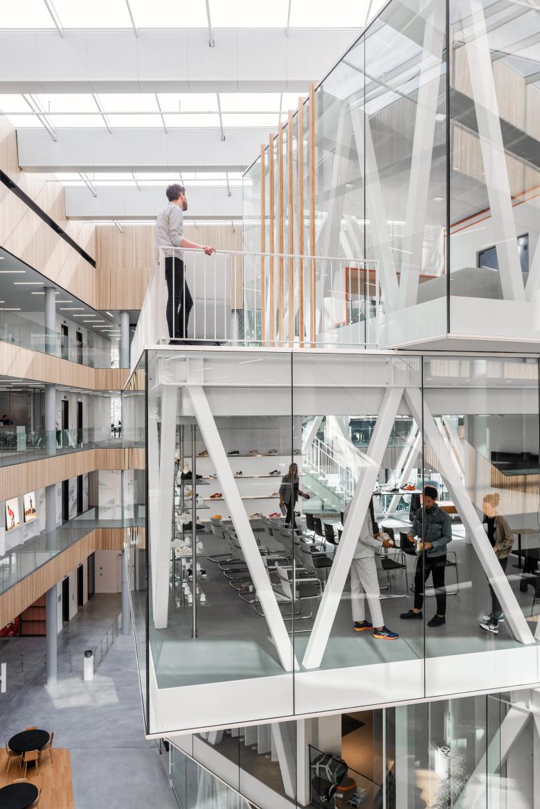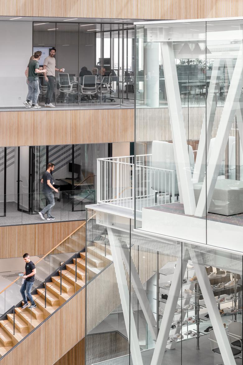 Catered specifically to ASICS' unique philosophy of ‘A Sound Mind in a Sound Body’, the building was constructed according to the latest standards in health and sustainability, as defined by the WELL Gold and LEED Gold certifications. The design team created a building that is not only beneficial for its surroundings by saving energy, water and reducing CO2 emissions, but also ensures the wellbeing of its employees by focusing on a healthy interior climate and a comfortable, diverse work environment. Due to the strategic positioning of the staircases close to the atrium, users of the building will also be inspired to take the stairs instead of the elevators. This design feature was implemented to stimulate physical activity.