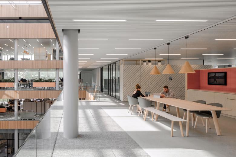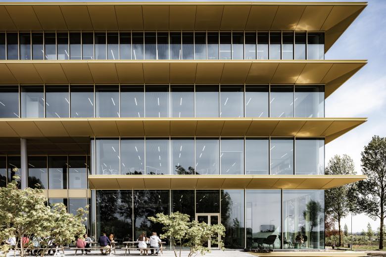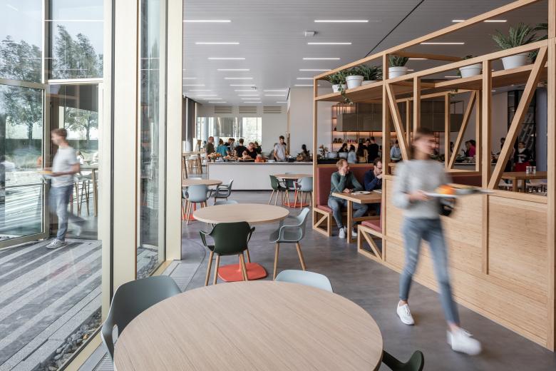 Powerhouse Company's future-proof design features an efficient and flexible layout to optimally support various types of work, geared towards innovation and collaboration. With floor-to-ceiling glass windows, each level is flooded with natural light and offers panoramic views of the Defence Line of Amsterdam that has been enlisted on the UNESCO World heritage list since 1996. The building’s full glass facade is complemented by sleek cantilevering roofs, creating a unique silhouette. On each floor, parts of the facade fold inwards to create terraces, giving direct access to outdoor spaces.