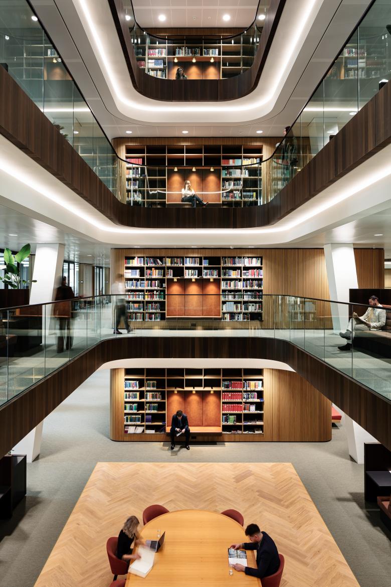 Concealed from the public areas, a second, inner atrium echoes the main atrium and allows the office floors to breathe. It provides a more private, library-like environment, with a variety of spaces for reading, meeting, phone calls and working. As it does throughout the 17,000m2 office, wood creates a warm, calm and natural environment here. The library shelving and seating elements are custom-made – examples of over 100 tailor-made joinery that we created for the Hourglass, each one adding its own sculptural presence to the space. These include a desk that allows for a variety of configurations, easily changing the use of the office where it is placed.