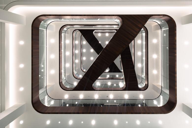 The law firm occupies two-thirds of the Hourglass building; 12 out of 18 floors, namely the bottom ten and the top two (a short-stay hotel occupies the intervening floors). The 17th floor is the office’s meeting center, with a wide variety of rooms for client briefings. Evoking the luxurious hospitality of hotels and VIP lounges, these vary in format yet echo each other in detailing and materialization. Above the meeting center, the loft is the social heart of the building, the place where the office entertains and celebrates in style. Correspondingly, the spaces here are more relaxed and lounge-like.