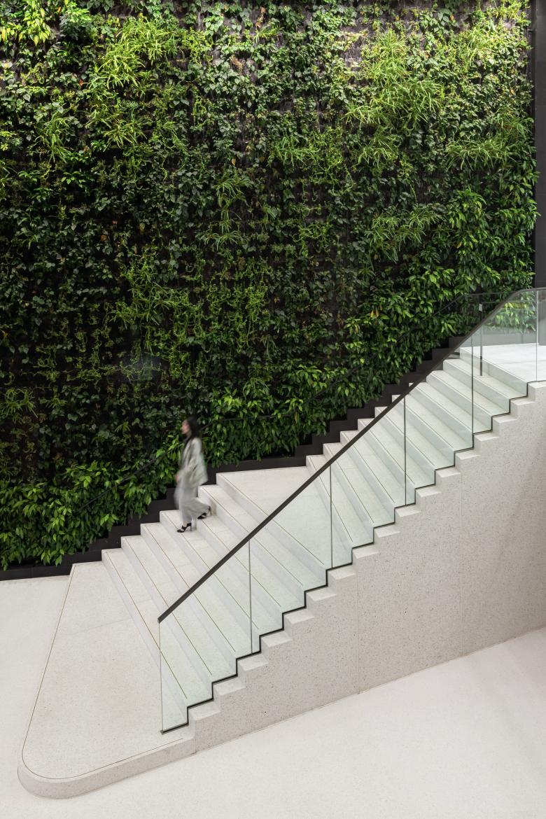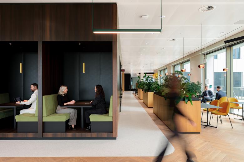 Our design opens up the lobby, greeting clients with an impressive welcoming gesture. Sweeping stairs, set against a green wall, lead upwards to the expansive atrium bathed in light. The lobby coffee bar adds to the feeling of informality and hospitality. For the law firm, the interior needs to combine very different needs: atmospheric public spaces like this for clients, staff meetings and socializing, and private working spaces for legal work. As confidentiality remains a key requirement, many of the 750 workstations are organized in closed rooms. While carefully ordered, these remain flexible for future changes in configuration. In between these ordered offices, we added more open working areas – for example at the corners of each floor – for support functions that need less privacy.