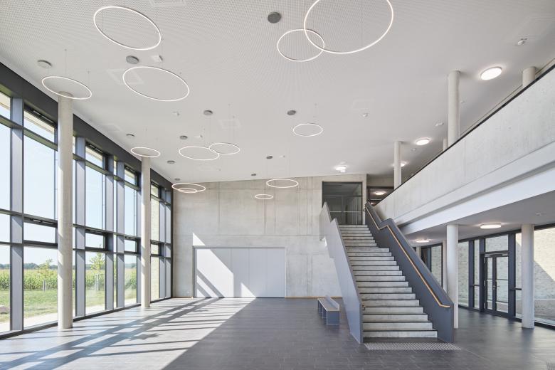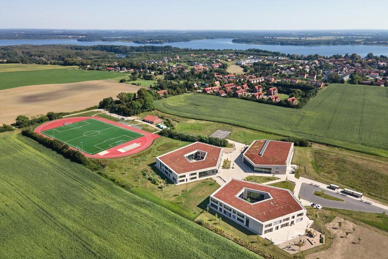 Die Gebäude des neuen Schulcampus in Zarrentin – die Regionale Schule, die Grundschule mit Hort sowie die Mehrzweckhalle mit zwei Sportfeldern und Mensa – gruppieren sich um einen zentralen Platz und wirken durch ihre flachen Kubaturen und die Klinker wie Steine in der Landschaft – markant, aber eins mit der Umgebung. Die mittig orientierten Haupteingänge mit offenen Eingangshallen fördern Kommunikation und Gemeinschaft, die einzelnen Baukörper bieten wiederum Identifikation und Rückzug, besonders durch die Innenhöfe der Schulen. Der Campus bietet 340 Kindern eine unterstützende Lernumgebung, schafft durch die auch für Vereine und öffentliche Veranstaltungen offenstehende Halle einen Übergang zwischen Schul- und Stadtleben und vermittelt durch seine Gestaltung zwischen Stadt und Landschaft.