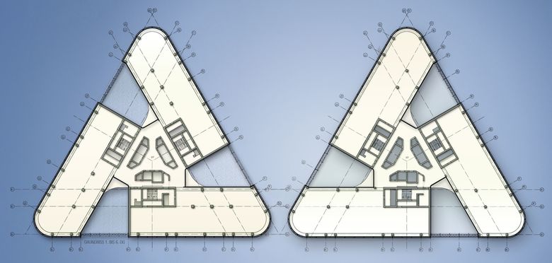 Standfest und doch in Bewegung? Vieles dreht sich im Alpha Rotex. Drehung ist Veränderung. Die Gebäudeflügel rotieren um den Gebäudekern und wechseln ab dem achten Stockwerk ihre Orientierung durch punktsymmetrische Spiegelung des Grundrisses. Das Tragwerk aus Flachdecken mit Stützweiten von bis zu 13 Metern ist dabei so organisiert, dass alle Stützenstränge ohne aufwändige Abfangekonstruktionen vom Dach bis in die Gründung durchlaufen.