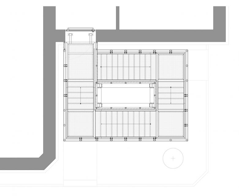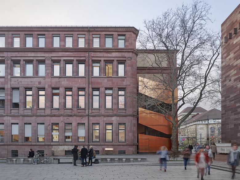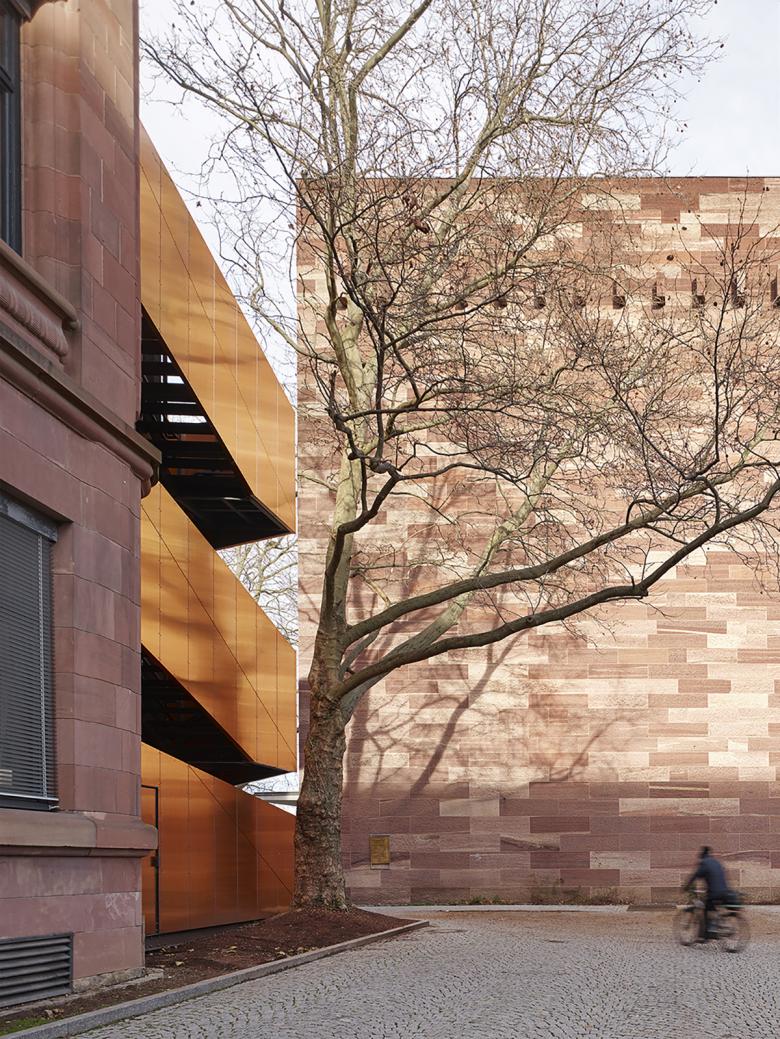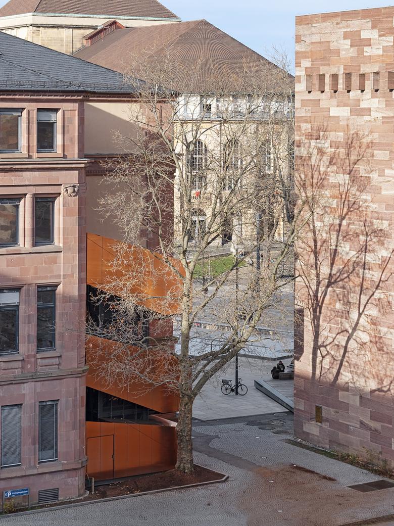 Eine bestehende Platane galt es zu erhalten und neben der Funktion als Fluchttreppe auch die Zuluftansaugung des benachbarten Kollegiengebäudes II unauffällig in die Gesamtgestaltung zu integrieren. Die Fluchttreppe ist somit auch Lüftungsbauwerk.
