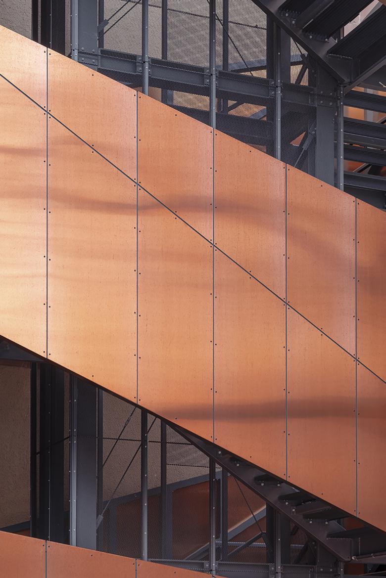 Die Wahl der Materialien und Bauteilqualitäten orientiert sich, neben den brandschutztechnischen Anforderungen, vor allem am sensiblen Umgang mit dem denkmalgeschützten Bestand. Während sich die Gestaltung und die Ausführungsqualitäten in den repräsentativen Innenbereichen am originalen Erscheinungsbild des Billing’schen Entwurfs des Hauptbaus orientieren, ist das Leitbild bei den ergänzenden Einbauten und Bauteilen eine eher abstrakte, moderat modernere Gestaltung unter Verwendung von dem Gebäude verwandten Materialien. Die abstrakt skulpturale Erscheinung des Treppenbauwerks tritt dabei nicht in Konkurrenz zum Bestand, sondern ergänzt diesen behutsam. Die sich mit der Zeit verändernde Kupferhülle greift dabei die Materialität von Blechdächern und Regenrinnen das Hauptbaus auf.