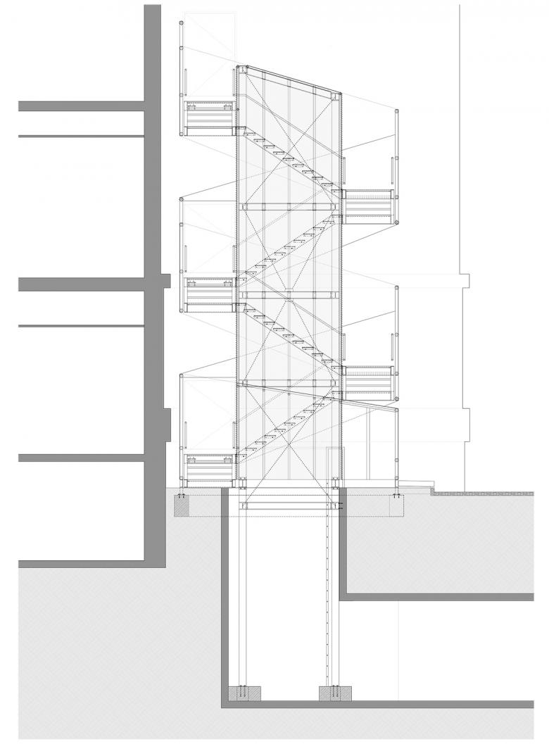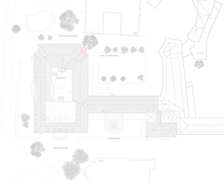 Die neue Außentreppe steht als eigenständige Skulptur in der offenen Nordostecke des Hauptbaus des Kollegiengebäudes I der Universität Freiburg. An dieser Position, der Schnittstelle von Platz der weißen Rose und Platz der alten Synagoge, ist sie zu beiden Plätzen gut sichtbar.