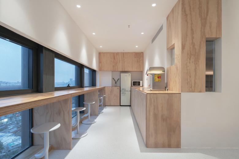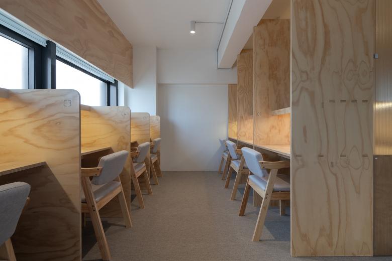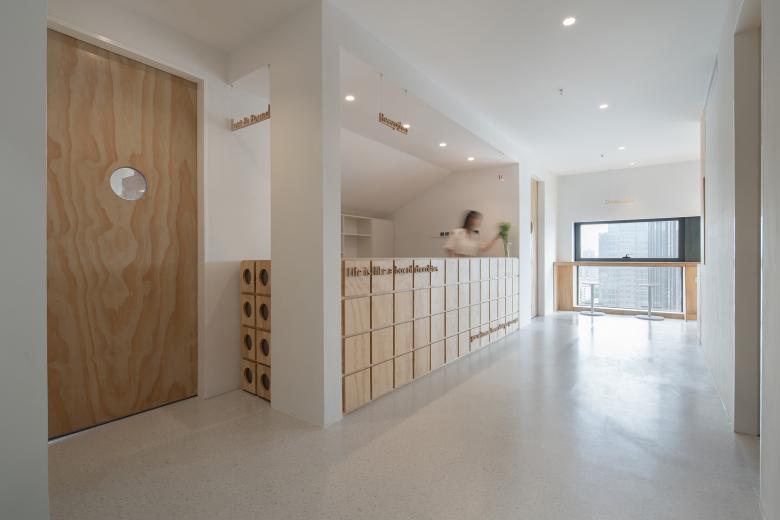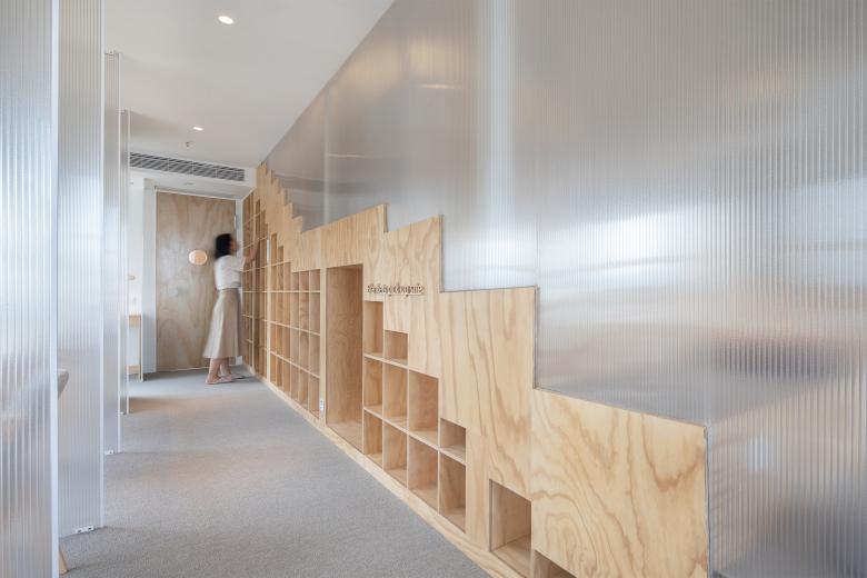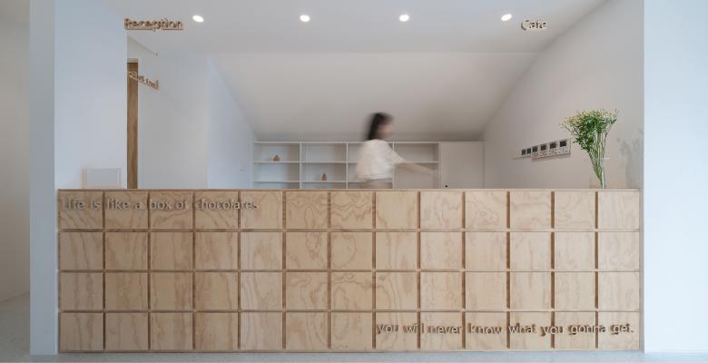 我们将项目分为前区(接待区)和后区(自习区)。进入到自习室,首先映入眼帘的是明亮接待区,这个区域包含着换鞋、储物、前台、就餐、会议室几个功能区块。我们在前台的设计里加入了一个个可开启的储物柜,每一个格子好像待人开启的巧克力盒子,你可以从中取出任何赋予学习的动力。