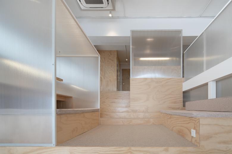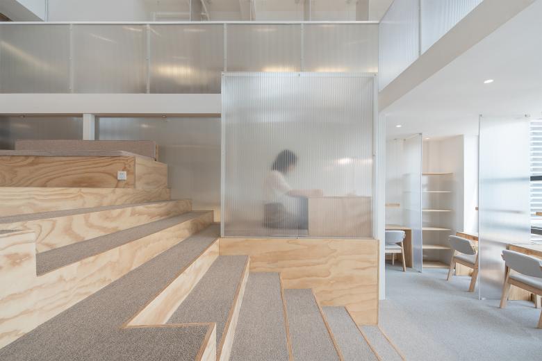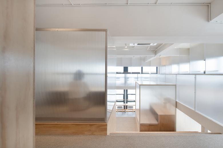 室内空间是一个规则的长方体,5.3米的建筑层高要分为两层空间会稍显压抑,于是我们将中央区域的二层楼板打开,植入一个大台阶,以台阶为中心连接上下两层,极大地消除了层高不足的压抑感。大台阶作为交通空间的同时,也兼具了休闲的功能,使用者可以坐在台阶上休息、看书、远眺、放松。我们有意将大台阶以东西方向布置,顺着台阶向上,翻越山丘式的半透明体块,可坐可立,远方的视野越来越清晰。坐在台阶上面朝东侧城市景观,远处是苏州高新区的地标性建筑,近处是老城区的苏式住宅。在不同高度的台阶上看到的是不同的风景,眼前是烟火气息的生活日常,远方是众星拱月的梦想山巅,人生亦是如此。夜幕降临,台阶下的小屋点亮暖意,轻声翻阅书籍,裹一条毛毯,沉浸在自由和梦想的怀抱里。