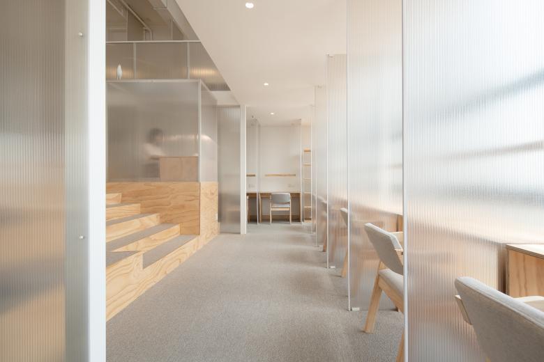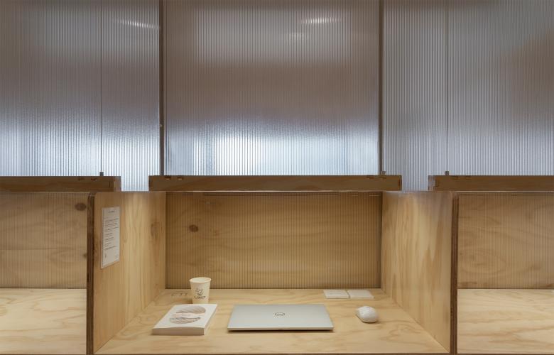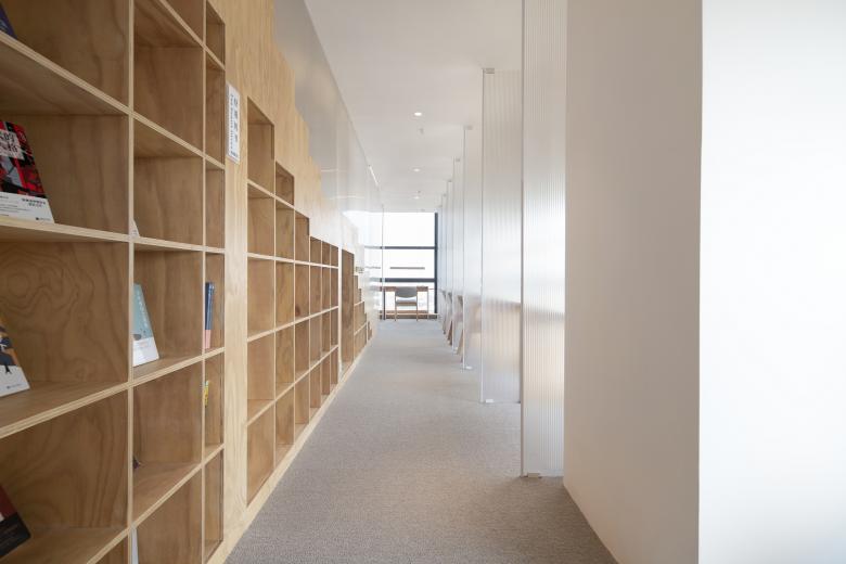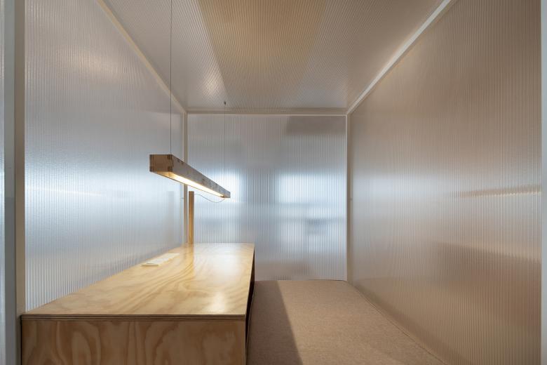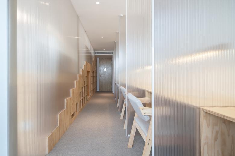 推开木门进入学习区,两侧被朦胧的阳光板遮蔽,只能看到用功学习的背影和远方蓝色的天际。半透明的隔断是两个座位之间的分割线,也是连接点。在各自隔断内自习的人如同两个平行空间里的人,看似没有交集,却又做着一件相同的事情。连续的半开放隔间阵列成有序的组件,光透过阳光板将空间渲染成层叠的书页,一层一层,一页一页,与光同尘,与影同伴。