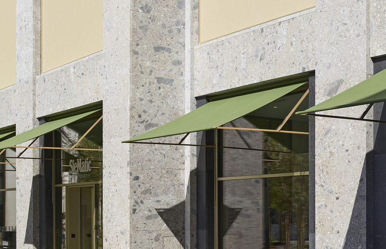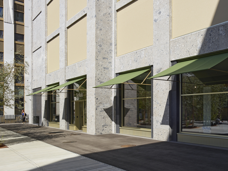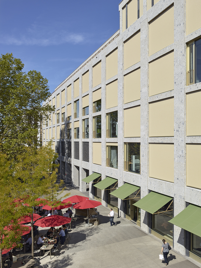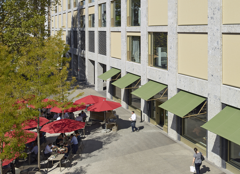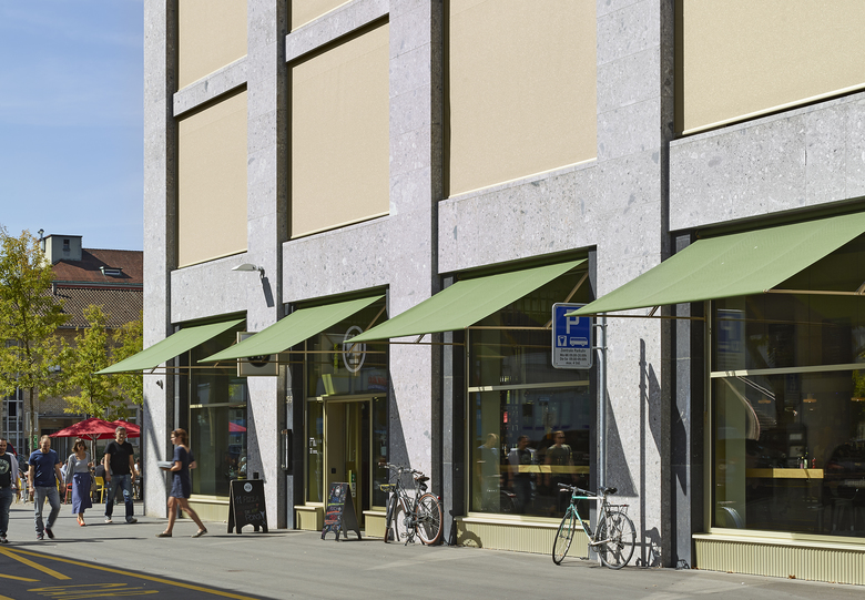 Im Geschäftshaus am Schiffbauplatz sind im Erdgeschoss Verkaufsflächen und Gastronomiebetriebe eingemietet. Zur Beschattung der grossen Fensterflächen wurden verschiedene Bedürfnisse abgedeckt. So sollten die Geschäfte und Gastrobetriebe von aussen gut sichtbar und einladend wirken und sich bei Sonneneinstrahlung nicht unnötig aufheizen und von innen Ausblick gewähren. Eine ideale Lösung für diese Ausgangslage ist die SUNLINE® 6400 von Kästli Storen. Die Ausstellstore ermöglicht dank ihrer Konstruktion auch bei grosser Ausladung grosszügige Durchgangshöhen und lässt Passanten ungehindert zirkulieren. Die aus Stahl gefertigte filigrane Store eignet sich auch für Balkone und macht sich sowohl an historischen als auch an modernen Gebäuden gut.